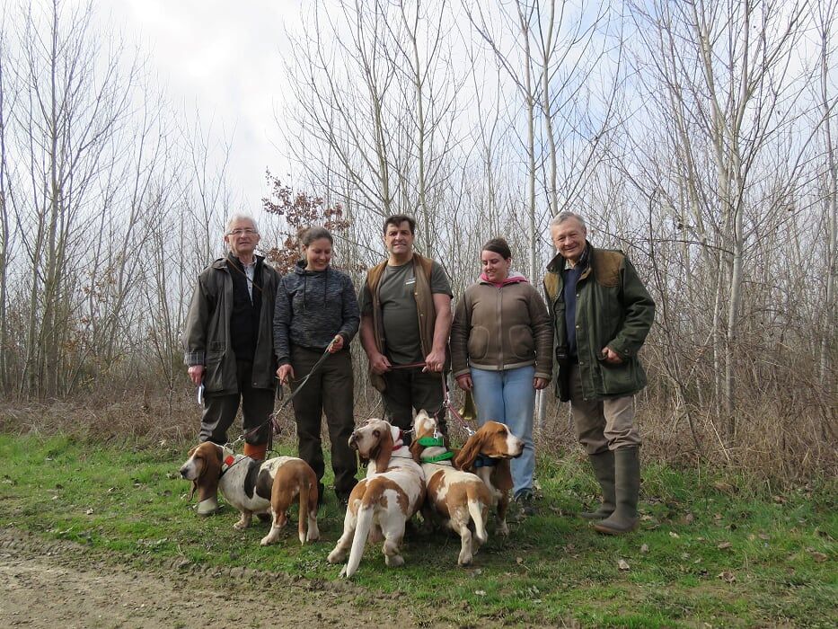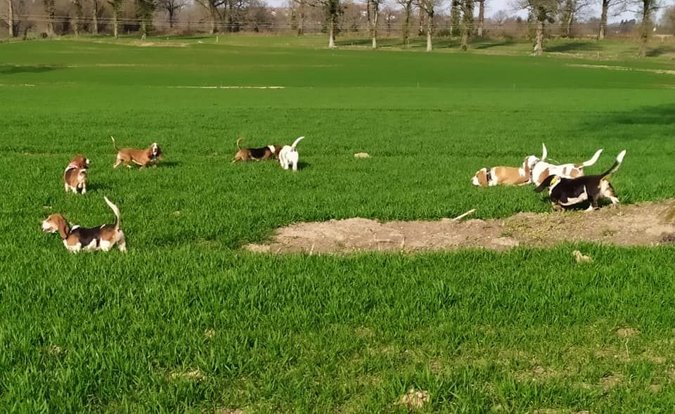 Lot n° 11 : 8 Bassets Hound d'un bon modèle appartenant à la meute des Côtes de la Saunade et Mme D****, Mme C**** et Mr D****.Découplés à 15h05 au lieu-dit « Masmaud », les chiens quêtent un long moment en plaine. La conductrice porte ses chiens sur un chevreuil qui se dérobe. Une chasse se forme avec 4 chiens : OASIS, MUFFIN, O'NUTS et ORANGETTE. Après avoir relevé un défaut au lavoir, ils chasseront avec vigueur jusqu'à la fin du temps imparti, bien emmenés par O'NUTS et OASIS. Les quatre autres chiens n'ont pas fourni une prestation suffisante pour l'obtention d'un brevet de chasse. (4 chiens de ce lot ne nous appartiennent pas)