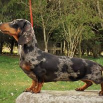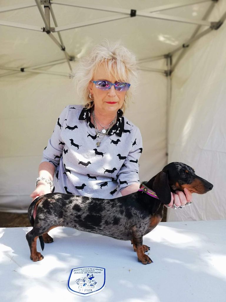 Arlequin noir Dcc OK, tour de poitrine 32cm, bonne sortie d'encolure, poitrine correct, très bon dos en mouvement, applombs avant et arrière correct, ?il gauche légèrement vairon. Ce juge n'aime pas du tout les arlequins, je tiens à le préciser.