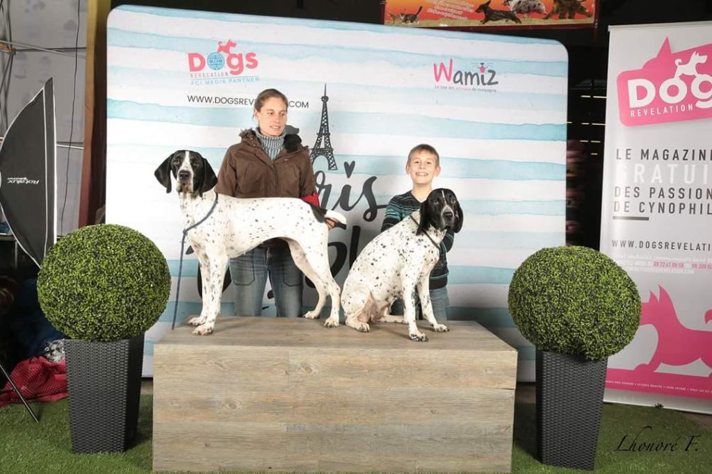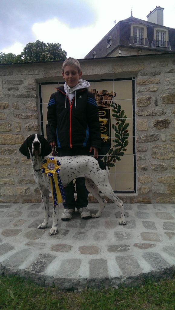 Chienne se présentant timidement, Exc tête avec de bonne proportion, Exc narines, Exc ?il, l'attache de l'oreille pourrait être légèrement plus haute, Exc épaules, Exc ligne de dos, Exc poitrine, Exc cuisse, pieds légèrement écrasé à l'arrière