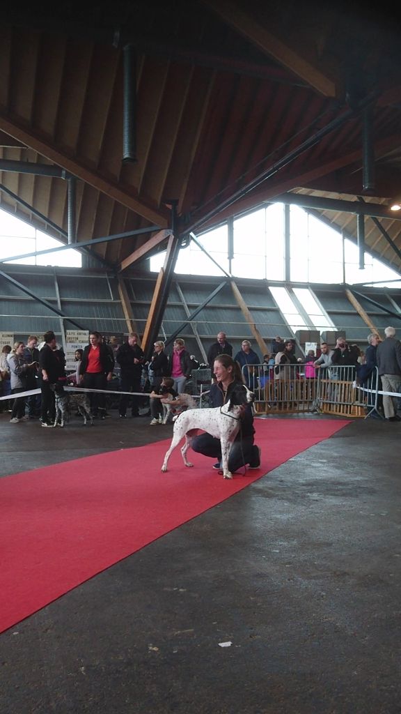Grand modèle pour son âge avec une tête bien dans le type, une encolure suffisante, une ligne de dessus correct, une belle croupe et un beau fouet, l'angulation tient trop droite à l'AV et correct à l'arrière, poitrine très légèrement levreter, Exc pieds, Exc allures, chienne à revoir plus tard