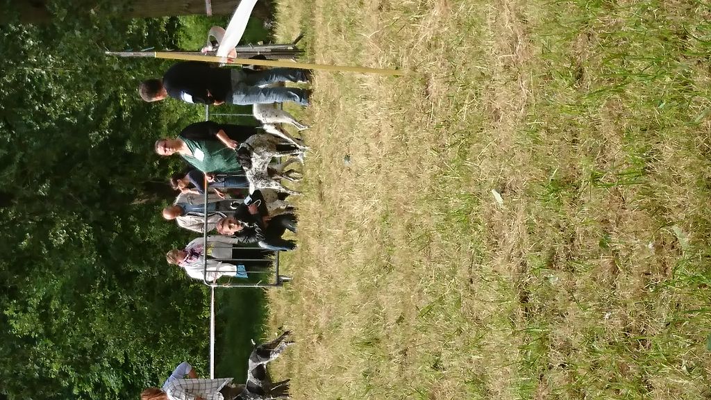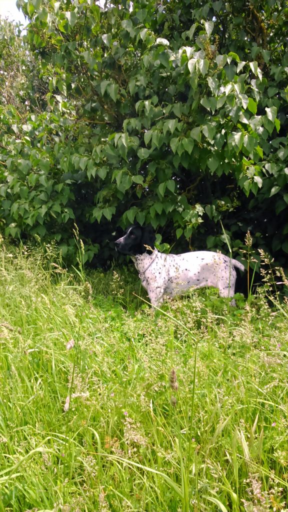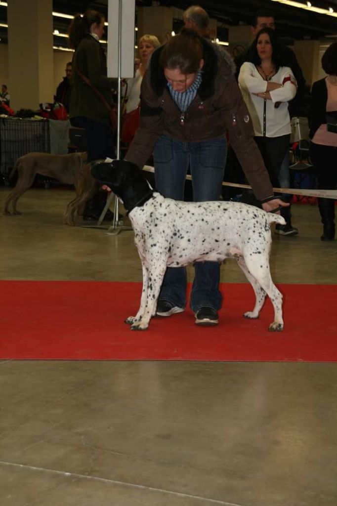 Bien dans le type avec une belle expression de race en tête, Exc tête, Exc oreille bien attachées et de bonne longueur, Exc ?il avec un bon iris, Exc sortie d'encolure, le dessus devrait être mieux tendu en statique comme à la marche, corps dans le carré Exc fouet, angulation, pigment et tissu, Exc pieds, aplomb correct et démarche correct