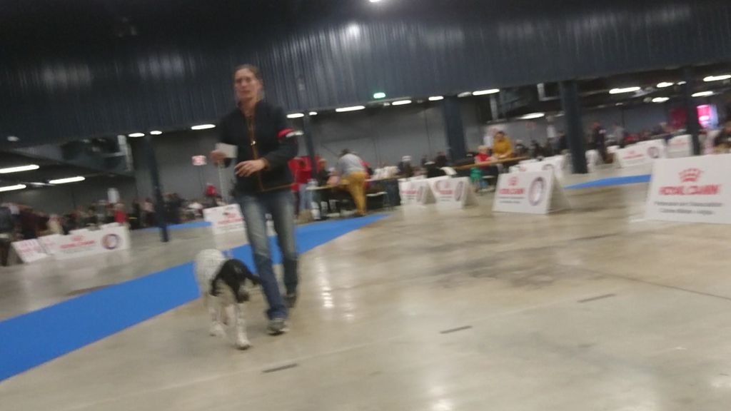 Exc tête, Exc encolure, Exc ligne de dessus fouet et attache, poitrine bien descendue, les angulation sont suffisante, pieds bien tenu mais ecarte très légèrement tant de l'AR que de l'AV, chienne bondissante, un peu timide dans sa démarche