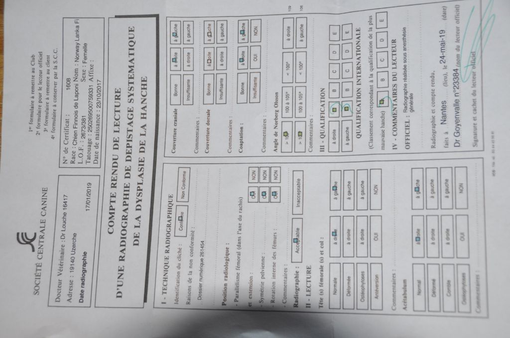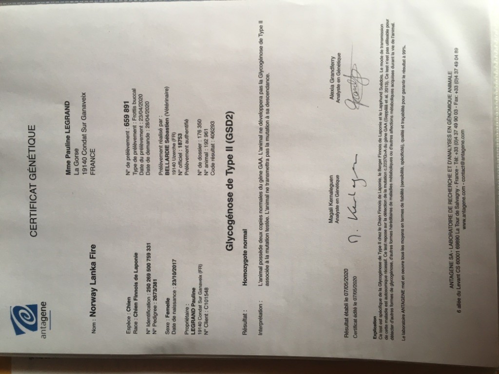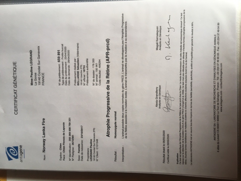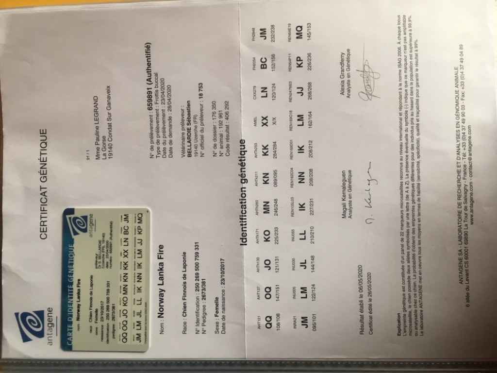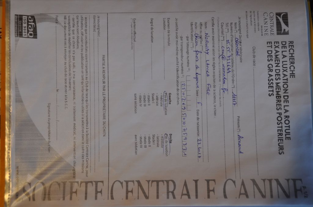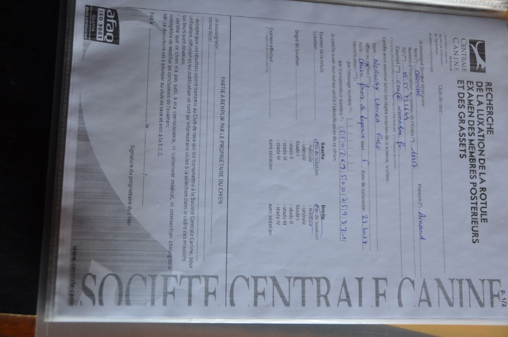 Luxation rotules - Indemnemaladie de la pompe - exempt ( antagene)Identification ADN - OuiDysplasie de la hanche - A/Adentition - DCCAPR -pcrd - exempt ( antagene),