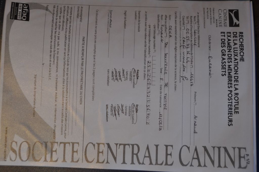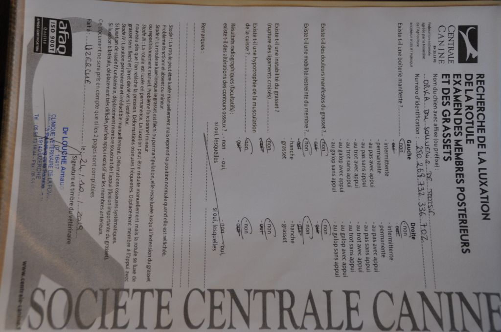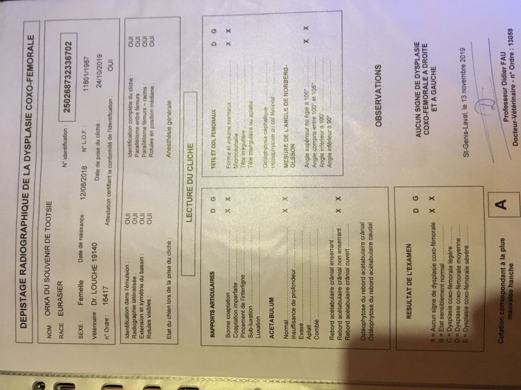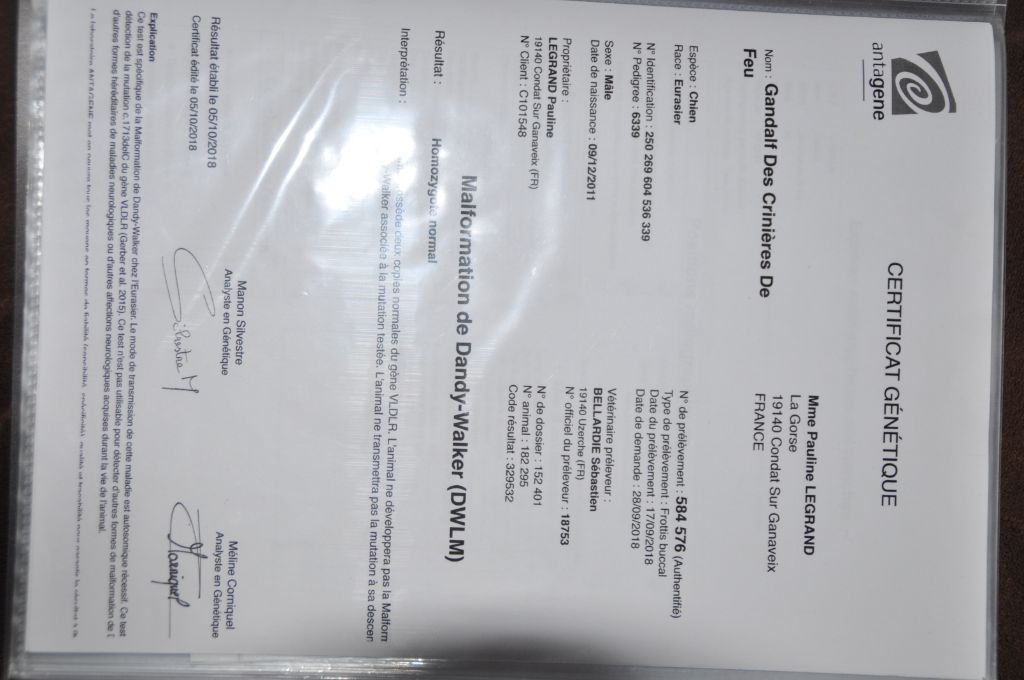 Dentition - DCCDysplasie de la hanche - indemne, ALuxation de rotule - indemnedandy walker - indemne par parenté