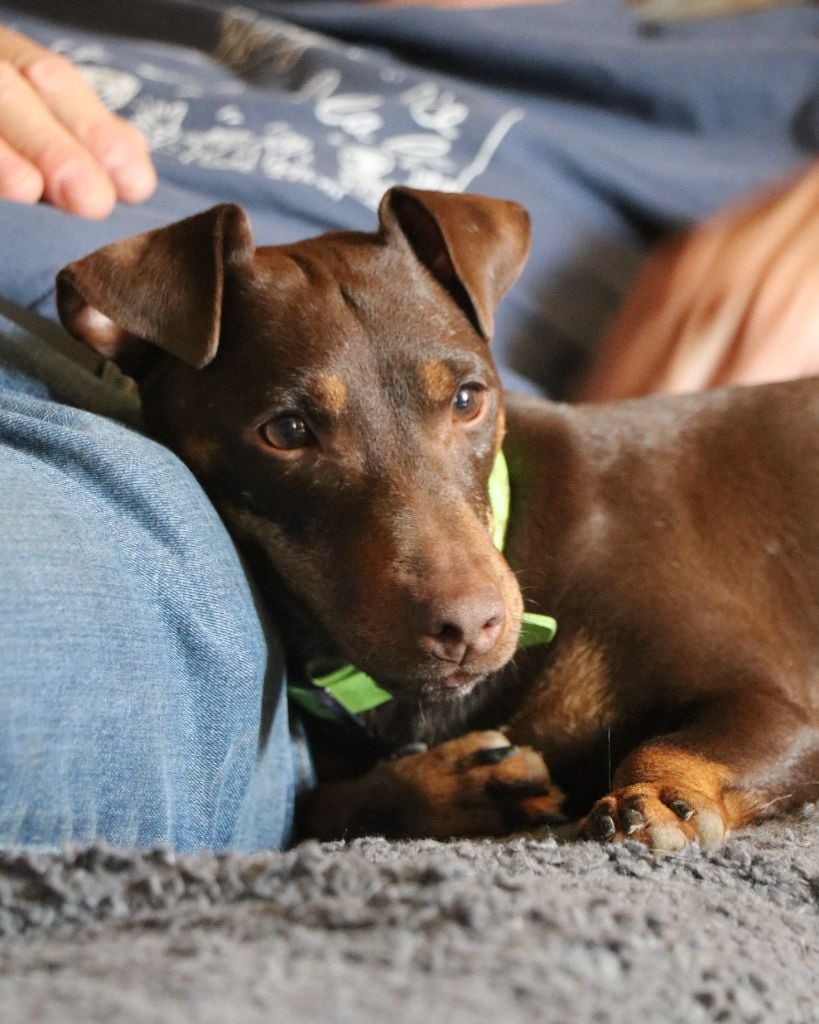 Dentition complète en ciseau. Poil lisse. Excellente tête. Port d'oreille correct. Bonne pigmentation. Nez pourrait être plus foncé. Bonne ligne de dos et cou. Pied parfait. Bonne poitrine. Doit s?entraîner à pratiquer la marche. Confirmée au LOF lors de l'exposition par M. Escoffier. Hauteur au garrot 33 cm. Tour de poitrine 43 cm.