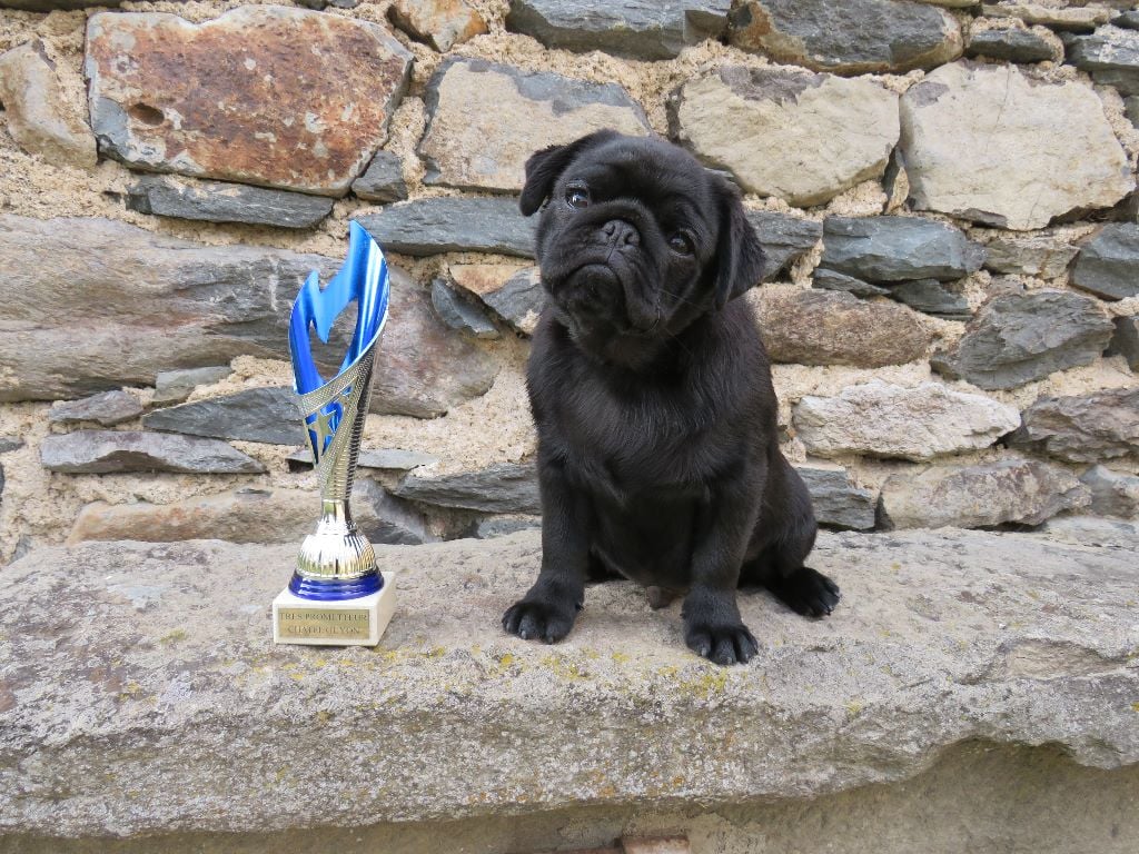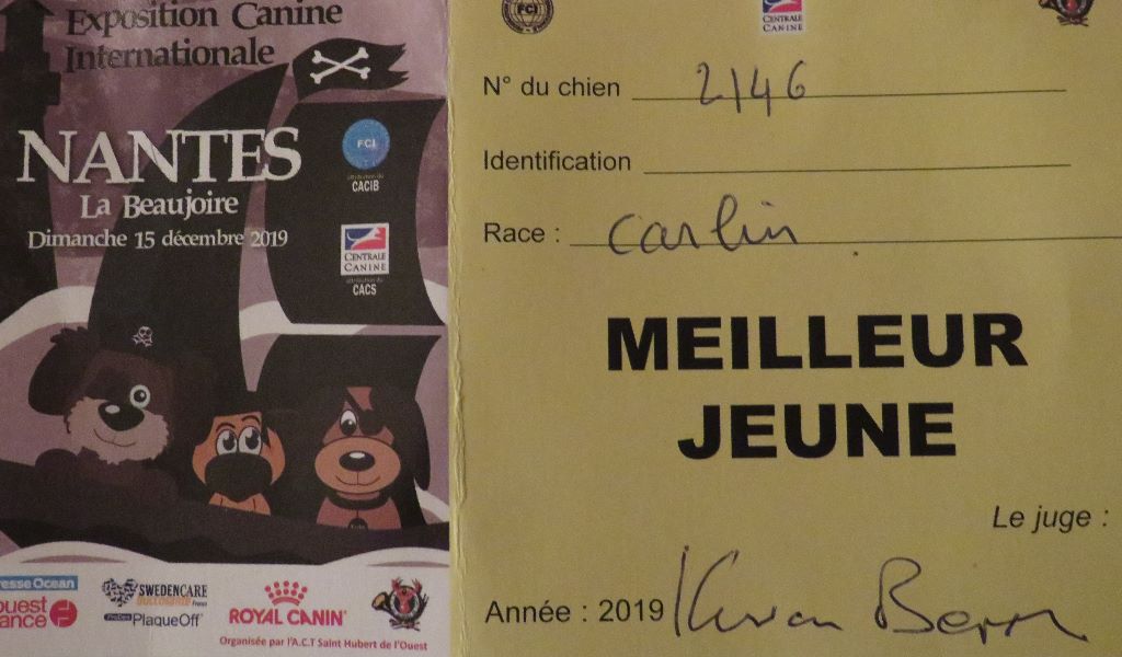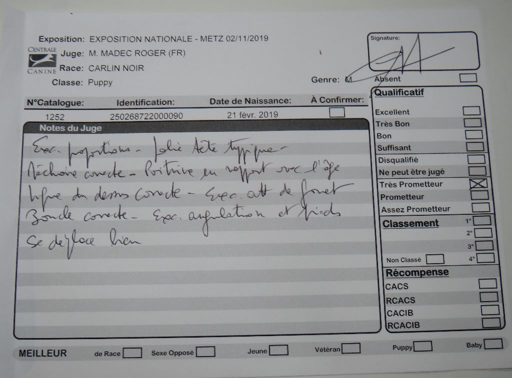 La juge lui donne un très bon car elle trouve qu'il manque de rides sur la tête et que son pli de nez et trop petit???? A l'heure ou le club de race la SCC et la FCI luttent contre l'hypertype et nous demandent de sélectionner des carlins avec des petits plis de nez et très peu de peau sur la tête, je ne comprends pas ce jugement!!!