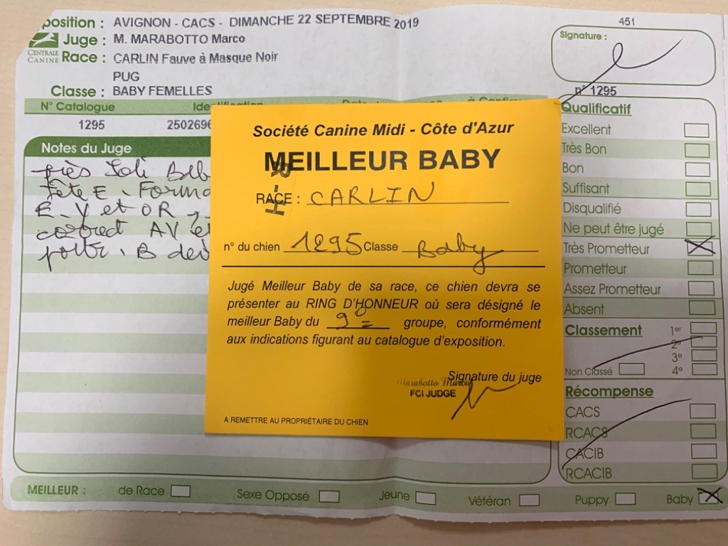 Vérification de Parenté (Mapple X Mr Jack) - Résultat : comptatible avec le mâle et la femelleTAN - oui 19/20Patella - 0/0Myelopathie Dégénérative (DM) - Homozygote normalADN - ouiCotation - Sujet sélectionné (3) Brachycephalic Exercice Aptitude Test for Health - APTE + (BREATH-1 +)