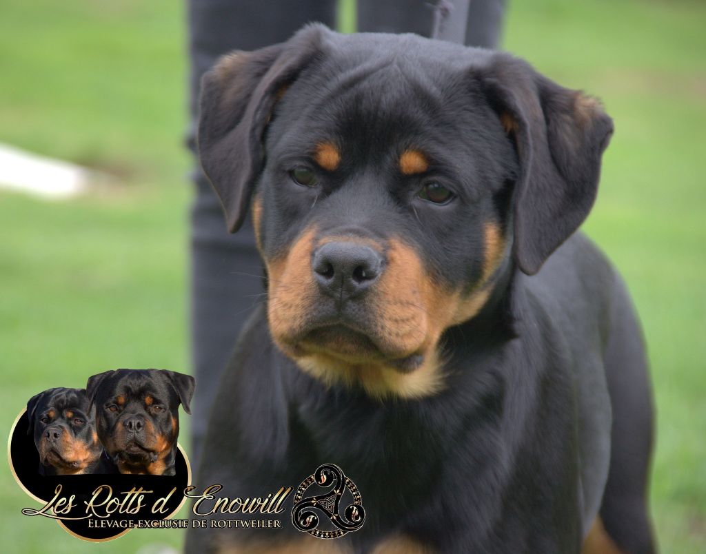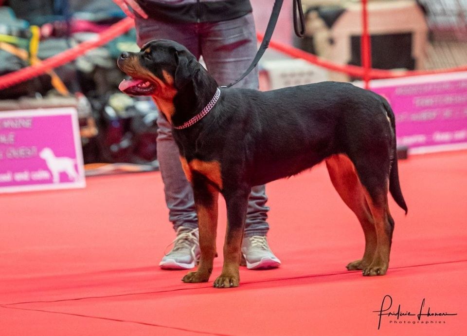 Bonne taille et couleur feux bien délimités tête typique dentition complete en ciseaux et bonne pigmentation bonne épaules, ossature et pieds.Poitrail déjà présent poitrine OK Bon dos, croupe, fouet et angulation arriereBonne démarche