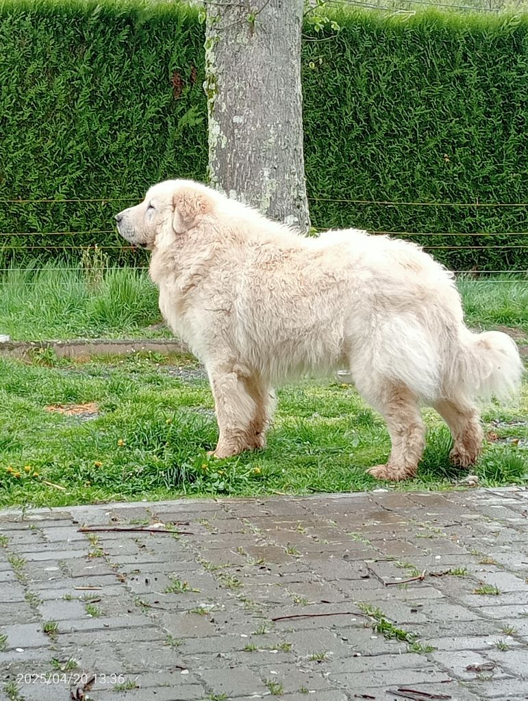 Chiot qui n'avait pas trouvé acquéreur car vite trop grand et resté à l'élevage finalement car il est si beau. Il est issu du champion d'Angleterre indemne de dysplasie des hanches ( HDA/A) Idris du Pyrdanti à Mr Lewis et de Mina du haras de Chante-neige , également indemne de dysplasie ( HDA/A) . Ours est un splendide mâle de forte puissance avec forte ossature. très grand, de 80 cm au garrot . Superbe construction, proportions, angulations, aplombs, pigmentation. Beau poitrail. Excellente tête typique de mâle,au crâne bien large, aux lignes bien douces sans asperités ni arcades sourcillières prononcées, avec excellent port d'oreilles, beaux yeux en amandes bruns, museau bien plein sous les yeux, truffe large, pas pointue . Excellent port de queue en statique et aux allures en roue .Excellents aplombs . Grosse fourrure avec excellente structure. Pas encore présenté en expo avant des années à cause de ma santé et comme je n' avais pas l'utilité en reproduction de ce fils de mon unique reproductrice, il a enfin été présenté à 5 ans pour sa confirmation et a eu son pédigrée LOF confirmé par Mr Pécoult qui s'est exclamé " beau chien !!!"