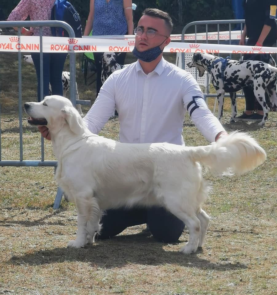 Jolie modèle, bien proportionnéeBelle tête, expression douce. Encolure, épaules, arrière main, ligne de dessus excellentes !Cage thoracique bien développée.Mouvements dynamiques1er Excellent CACS + Meilleur de Race + 3ème de Groupe 8 sur le ring d'honneur