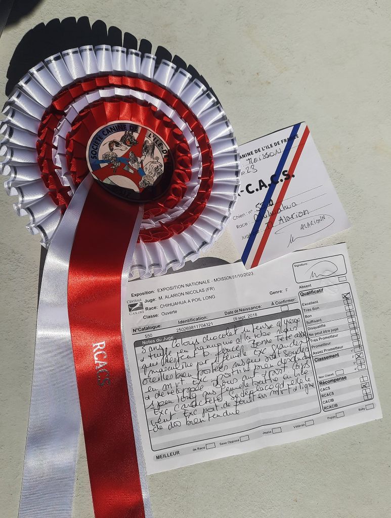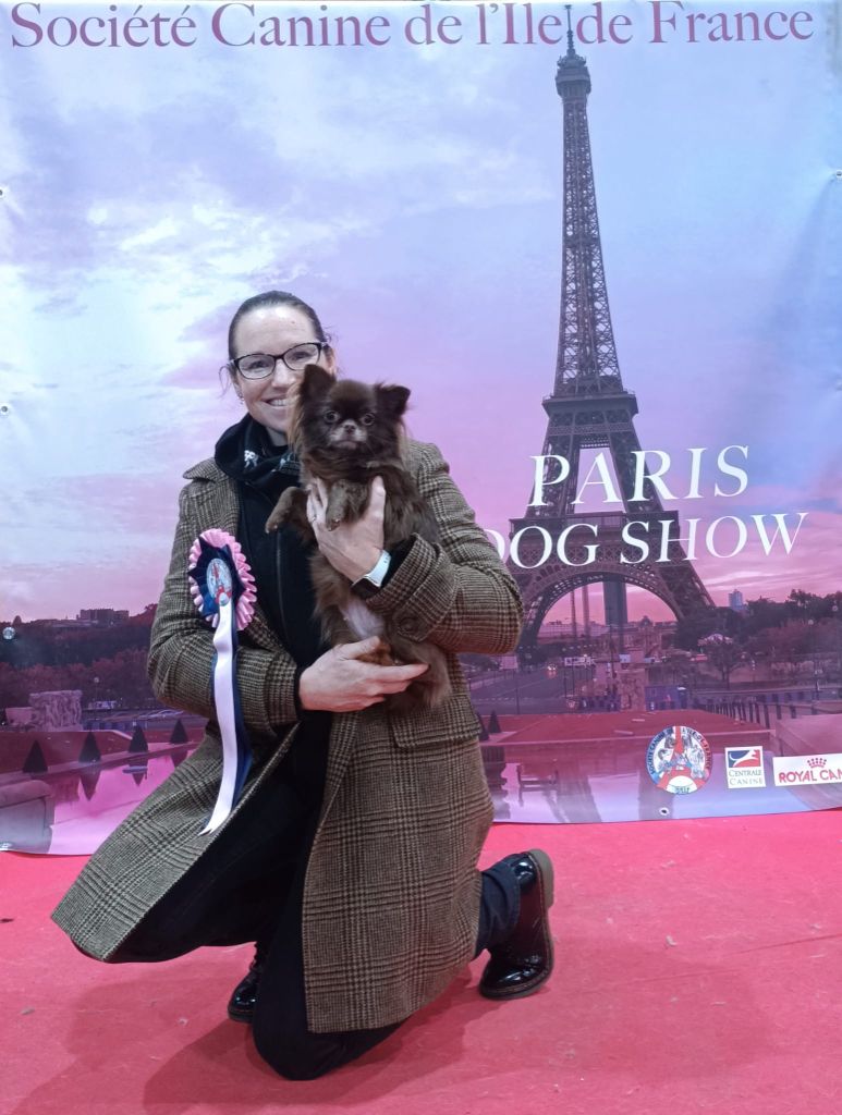 Coloris chocolat intense, yeux et truffe en harmonie avec la robe. Bonne tête assez masculine pour une femelle. Excellentes oreilles bien portées. Excellente poitrine bien descendue et développée. Bons antérieurs et postérieurs. Corps un peu long mais femelle bâtie en lice. Excellent caractère. Excellent port de fouet en mouvement et ligne de dos bien tendue.