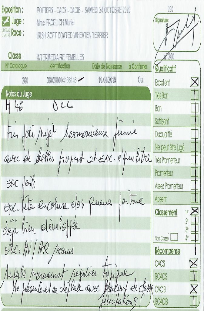 Mon commentaire perso : Ne pas avoir obtenu de résultat à cette Exposition n'est pas à un échec à nos yeux.Car Arancia ayant été sélectionnée lors d'une exposition Française qualifiante (comme tous mes précédents Wheatens, mais dans l'impossibilité à l'époque de nous y rendre), et avoir pu cette fois nous y rendre en famille a été la plus belle des récompenses et des victoires :-)