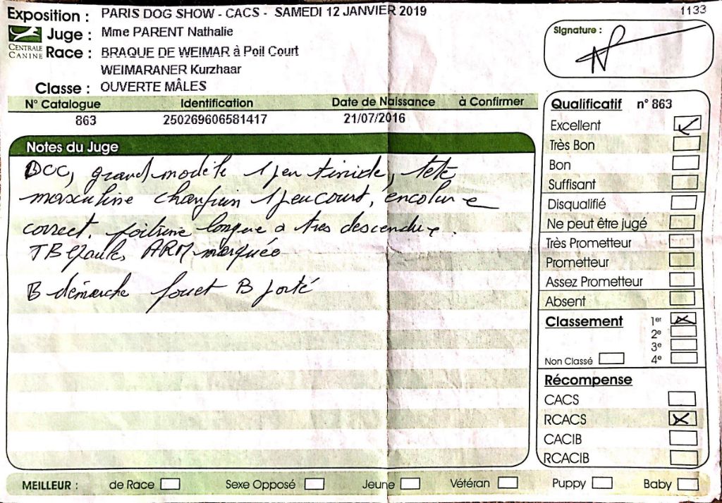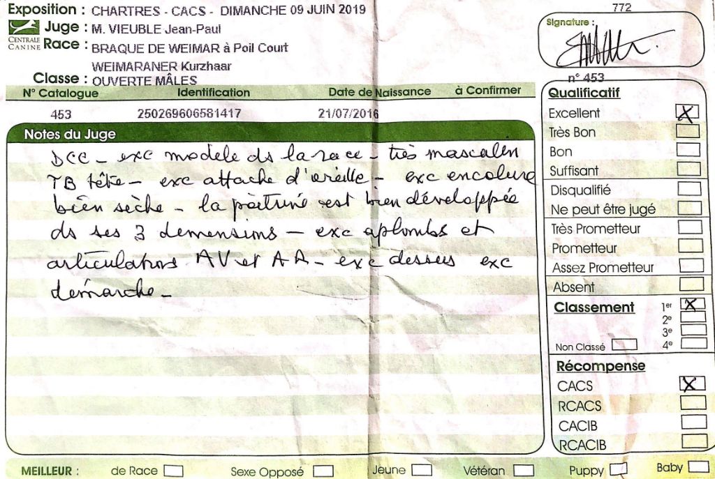 "Très masculin, très belle tête, excellent attache d?oreille, poitrine très bien développée dans ses 3 dimensions, excellents aplombs et articulations avant et arrières, excellente démarche, fouet très bien porté, très bonne angulation avant et arrière, excellent caractère".