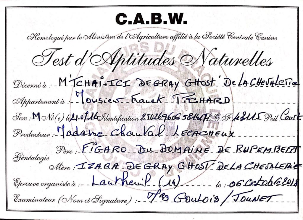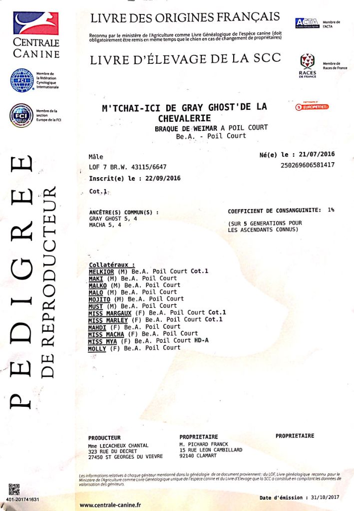 M'TCHAI-ICI De Gray Ghost de la Chevalerie (aka TCHAÏ) est né le 21 Juillet 2016 de l'union entre Figaro du Domaine de Rupumbert (père) et de IZARA De Gray Ghost de la Chevalerie (mère). Il est issu d'une portée de 14 Chiots.