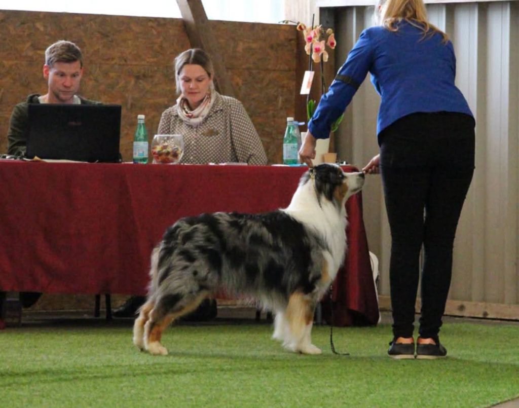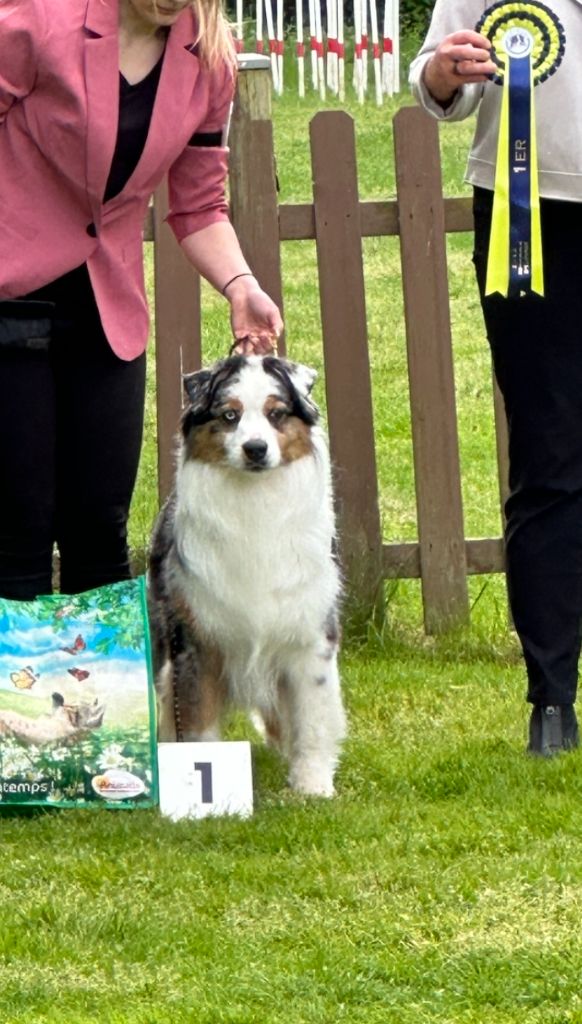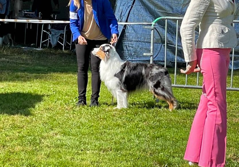 DCC Excellent caractère un plaisir !Exc type et format TB ossature Bleu merle belle robe fourrureMasculin et exc proprotionExc pigmentationEXC ligne de dessus la poitrine en croissance pourrais etre plus volumineuseBonne prise de terrain regulière une fois en route