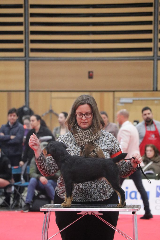 2 ans, bien développée avec ligne extérieure correcte, denture correcte, excellente épaule, taille correcte, bonne texture de poils. Fouet bien inséré, cuisses un peu ouvertes, bon tempérament, un peu irrégulière dans les allures. 1er excellent en classe intermédiaire.Réserve CACS et Réserve CACIB.