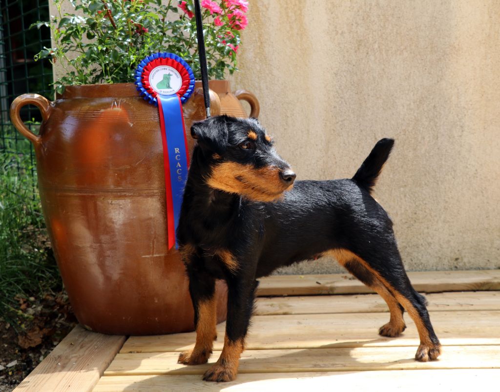 Chien bien construit dans son ensemble. La tête doit se finir. Le chanfrein doit s'élargir un peu. Bien typée. Excellents aplombs. Excellent avant, arrière, excellente poitrine.1ère excellent. Meilleure Jeune. Confirmée au LOF.