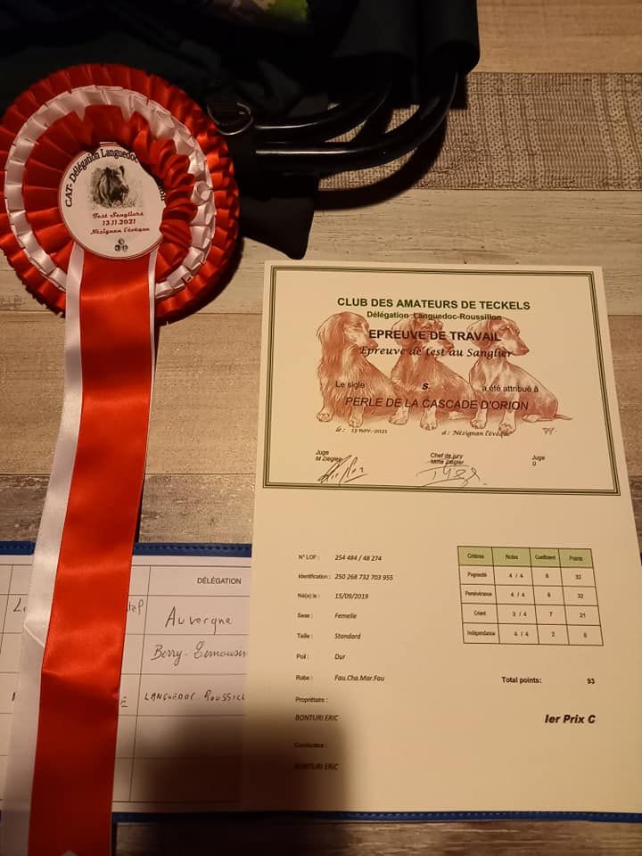 Epreuve S (sanglier) à Nézignan L'Evêque le 13.11.21 : 1er prix C 94 points.
