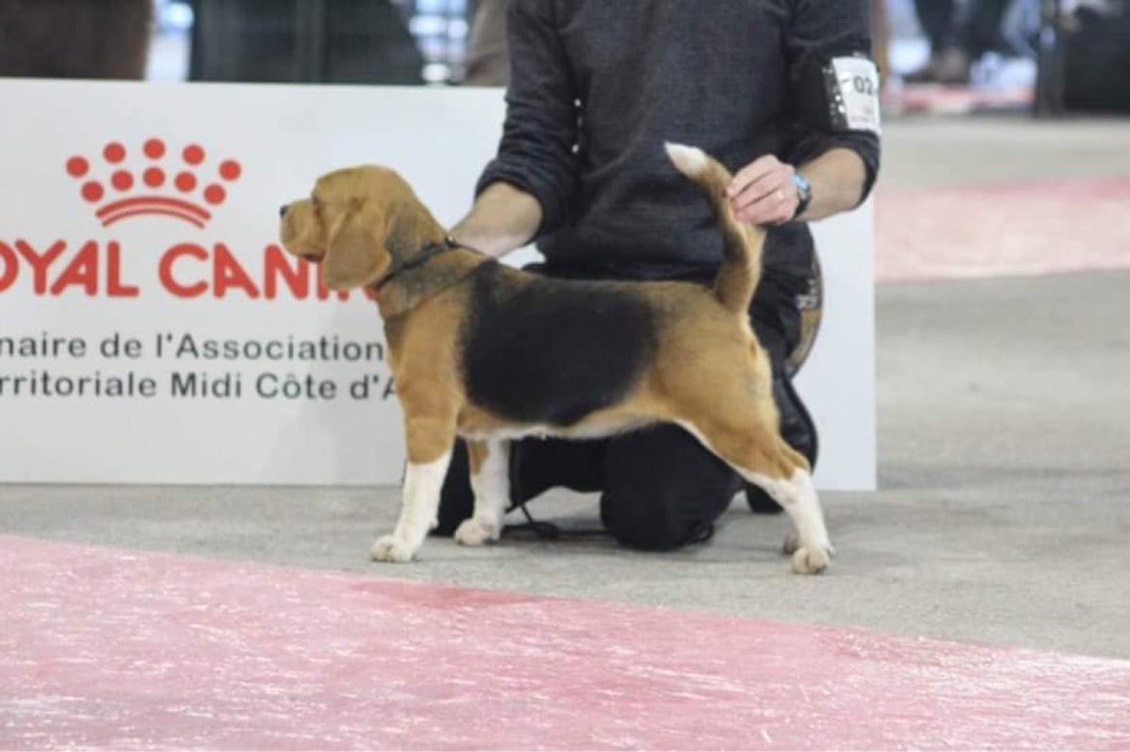 Dentition complète , jolie model , jolie tête , très bon chanfrein , excellente oreille , excellente aplomb et excellent ossature , excellente poitrine , angulation arrière suffisante , excellente attache du fouet , se déplace très bien .