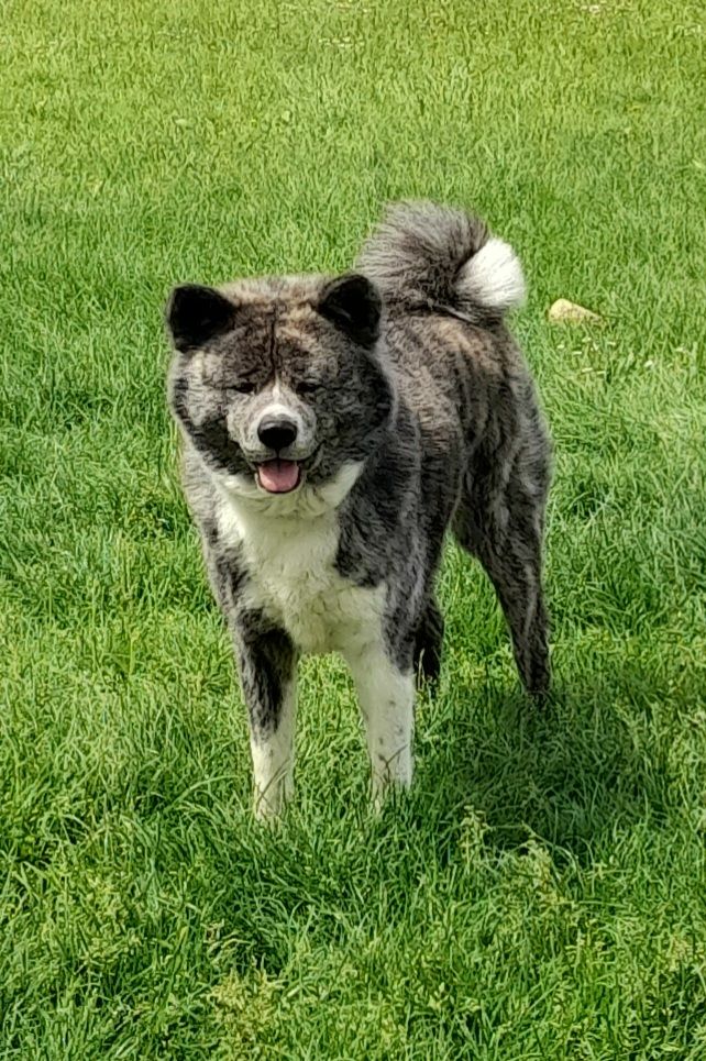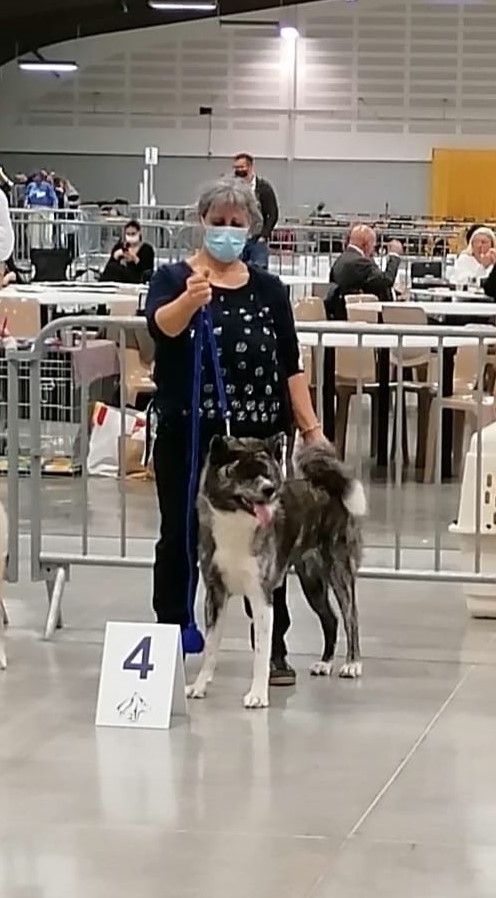 Bonnes proportions de tête, belle expression, bringé correct, angulations de postérieurs un peu trop marquées, queue portée basse en statique, mouvement suffisantPour le juge : elle est trop gentille pas encore trop le tempéramment de l'AKITA