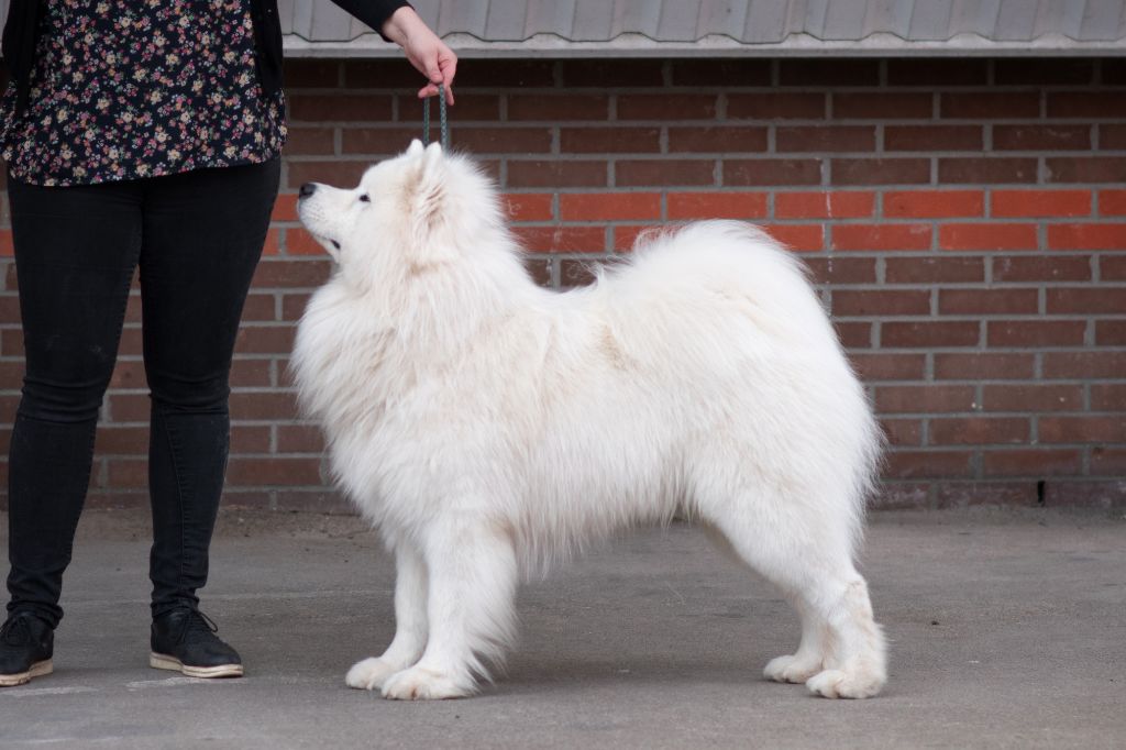 Grand modèle masculin, bonne forme de tête, excellente pigmentation, oreilles bien attachées, ossature forte, bonne poitrine, très bonnes avant mains, fouet bien attaché et porté, bonne fourrure, mouvement correct.