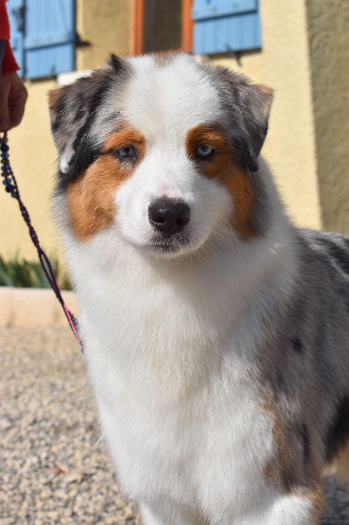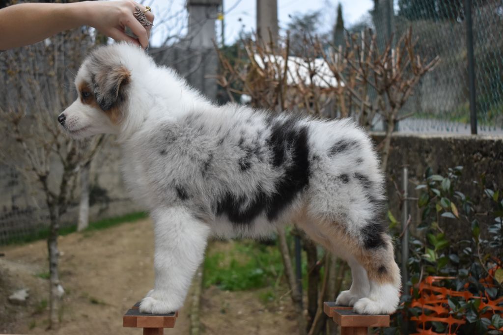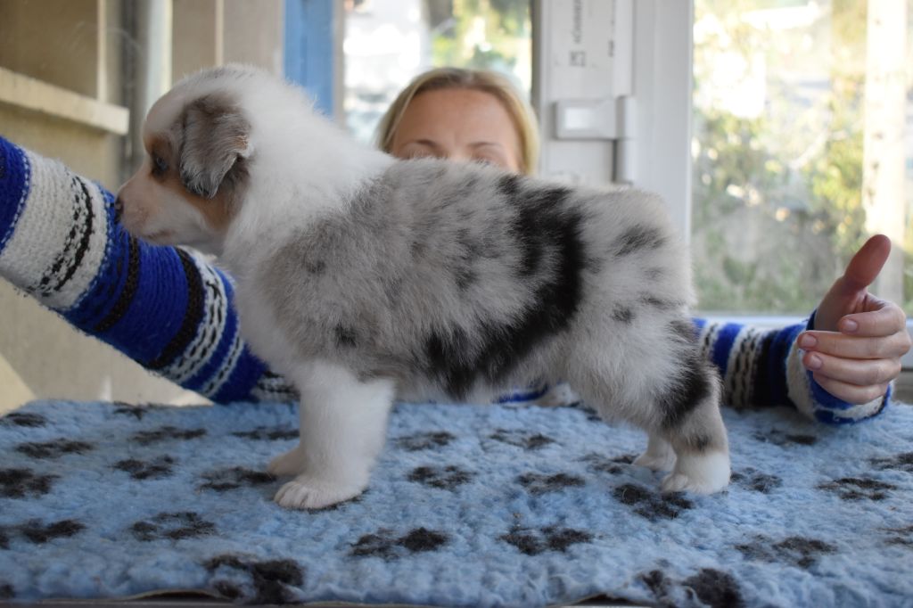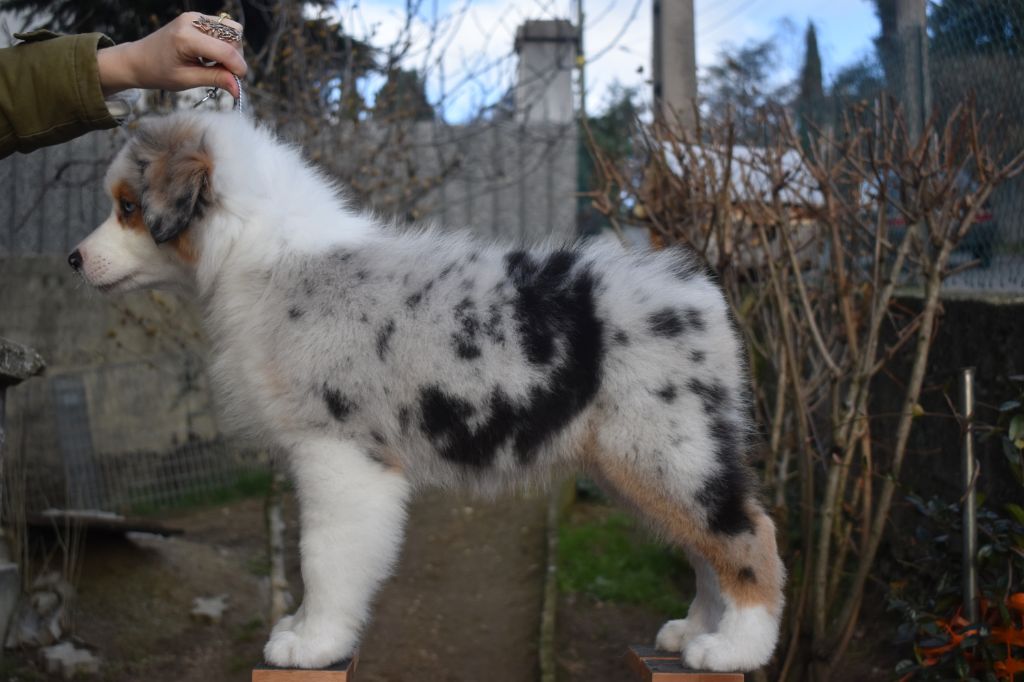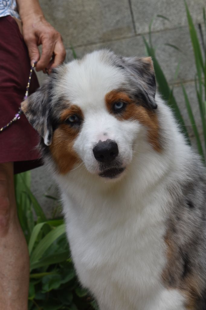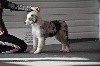 bleue merle, très joli bébé mais j'aimerais que la lèvre supérieure épouse davantage la ligne du chanfrein. Oreilles encore un peu lourdes. Très jolie construction et ossature. Déjà un bien joli déplacement.