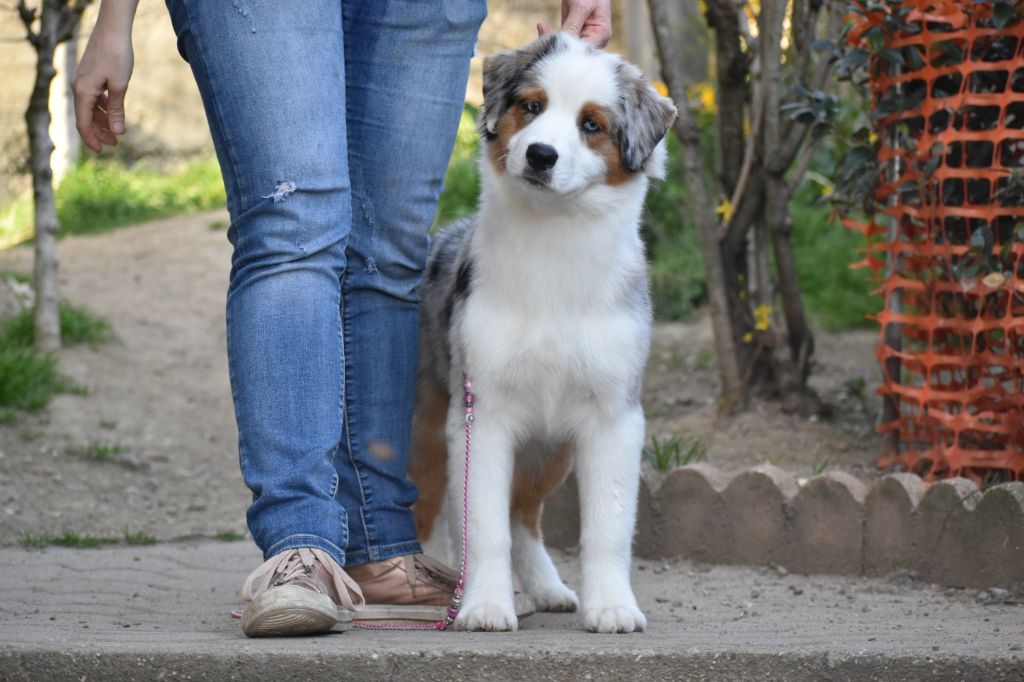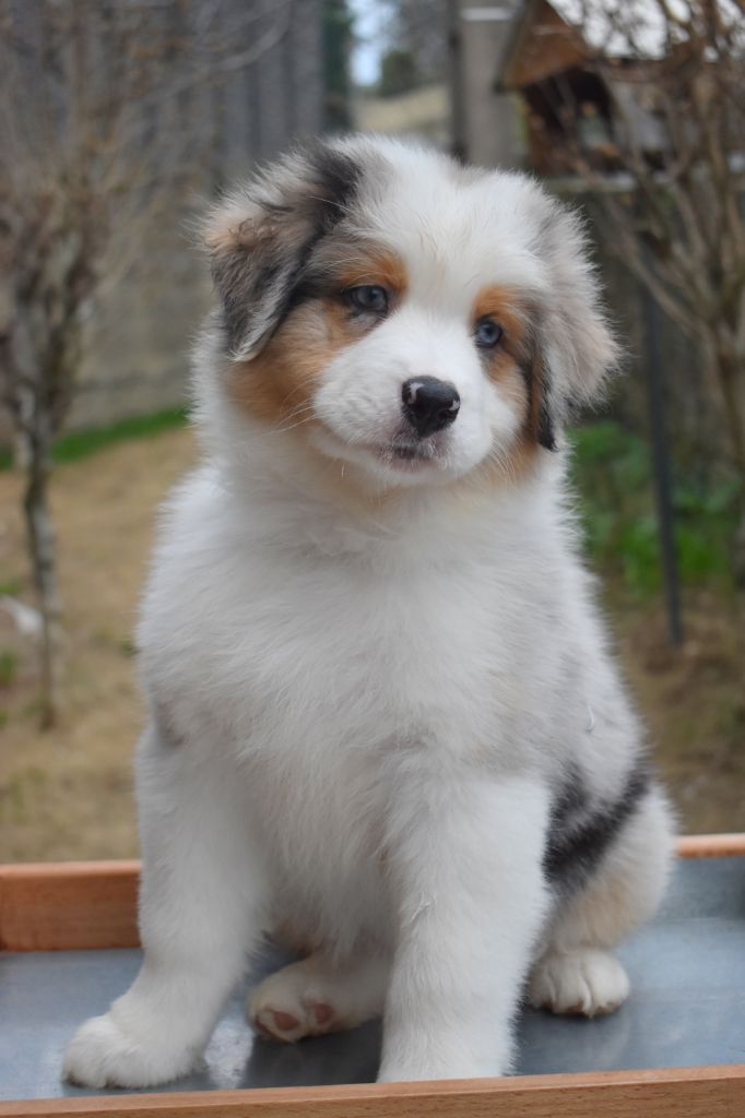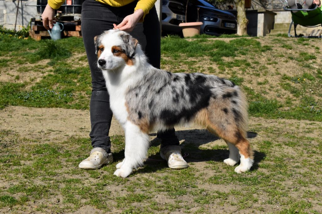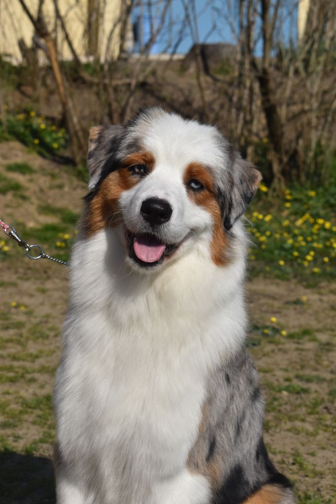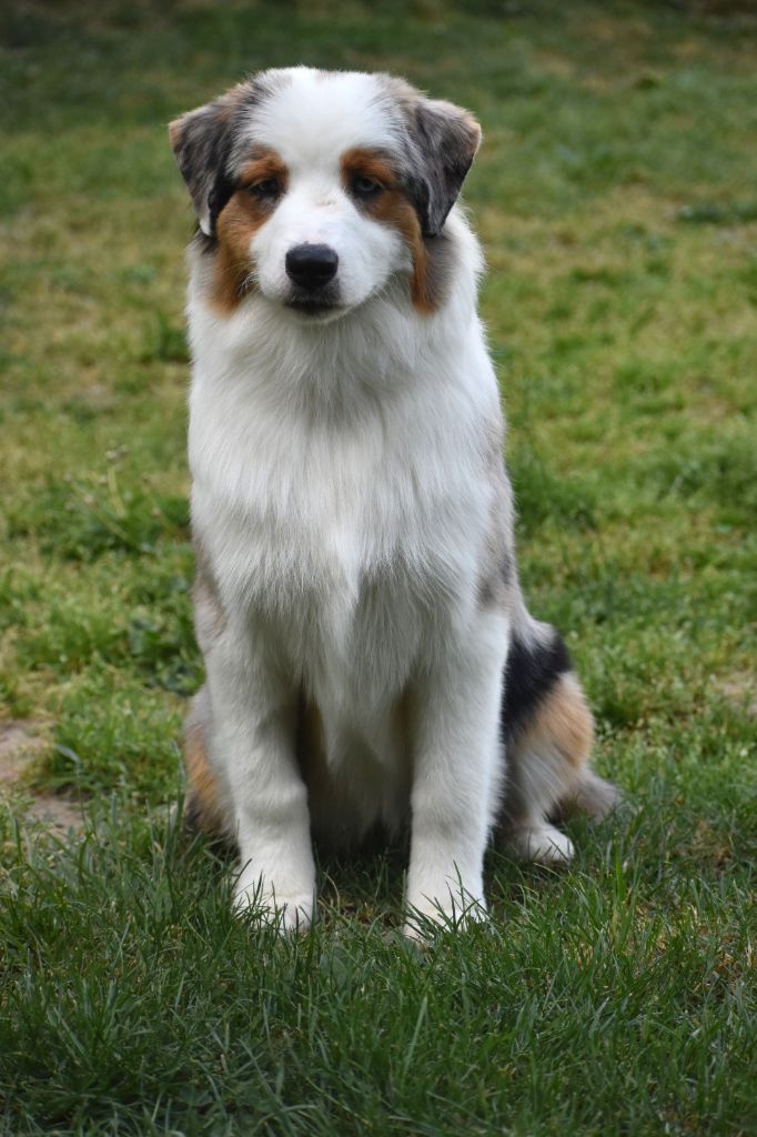 bleue merle, très joli bébé mais j'aimerais que la lèvre supérieure épouse davantage la ligne du chanfrein. Oreilles encore un peu lourdes. Très jolie construction et ossature. Déjà un bien joli déplacement.
