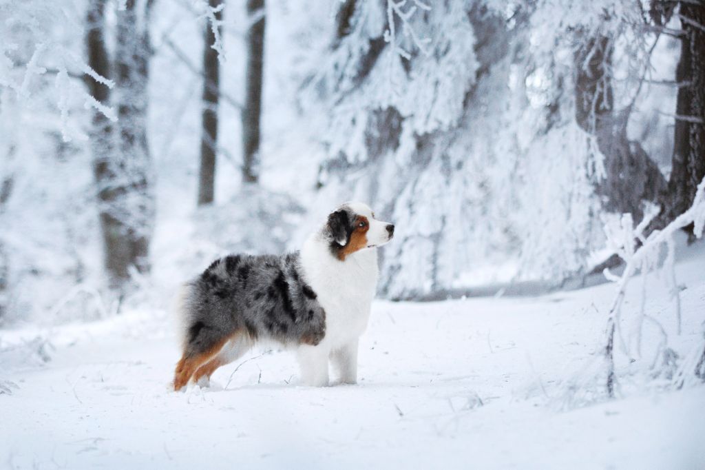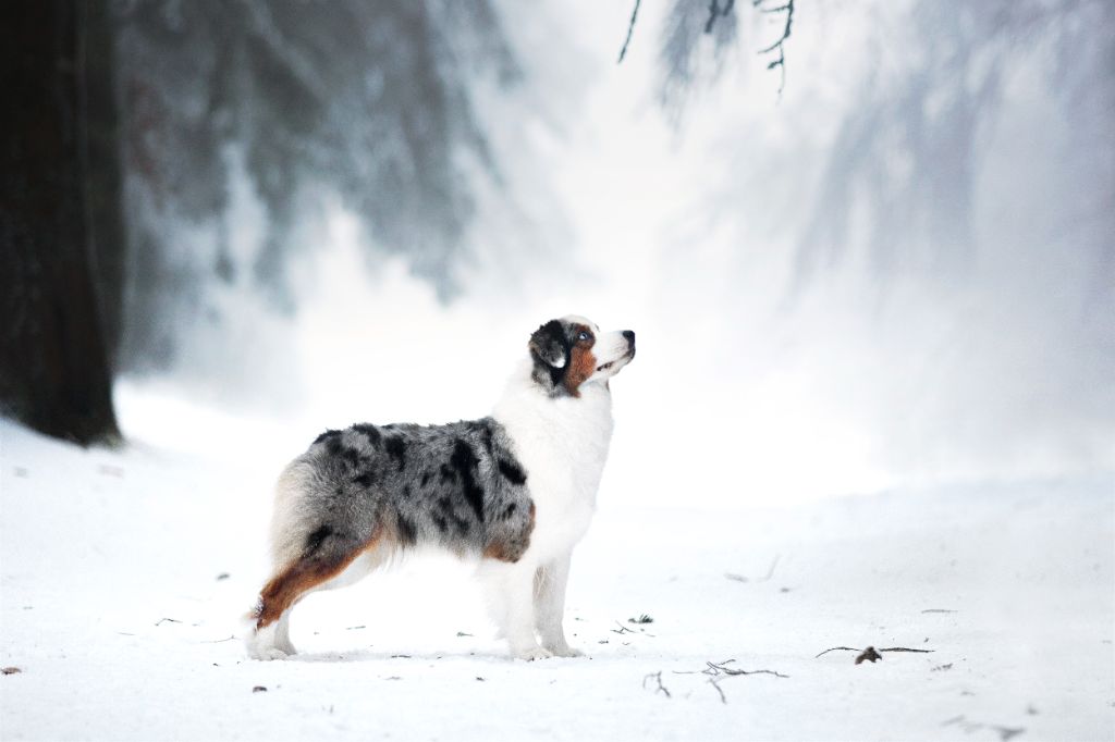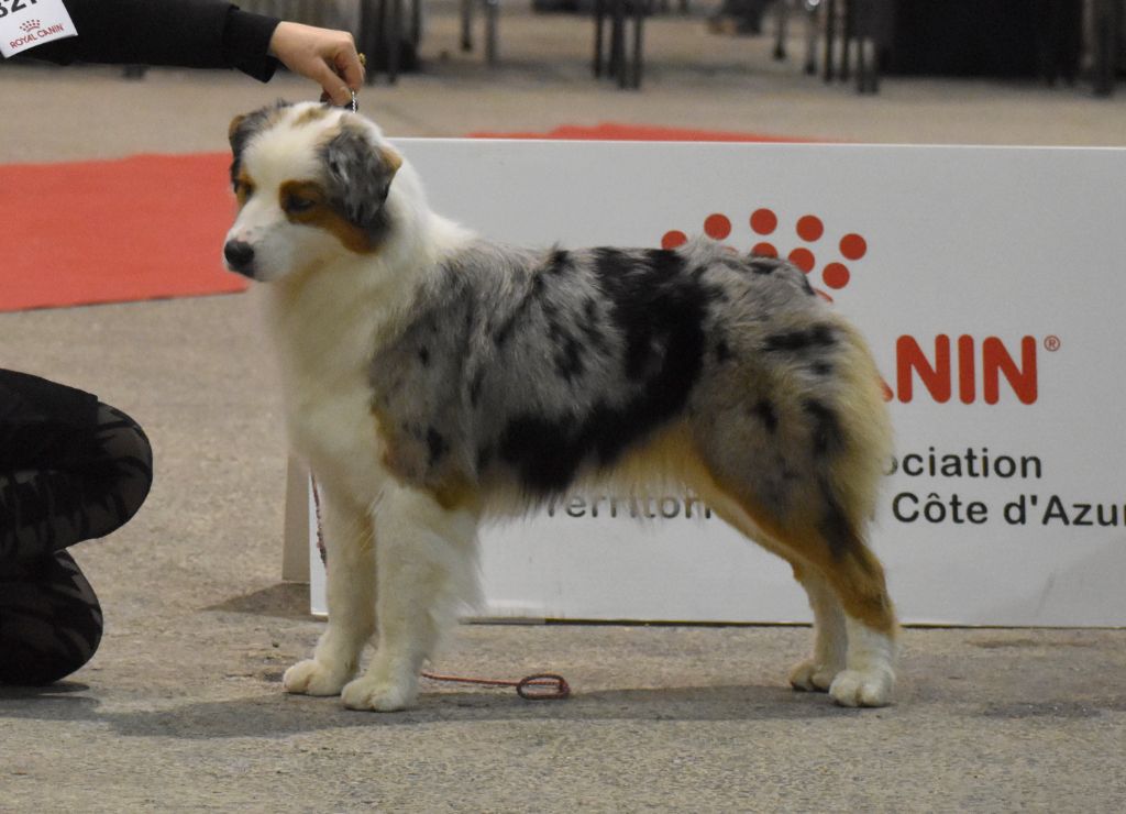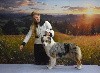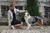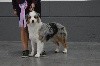 Bleue merle et blanc, excellente couleur, change de poils, excellente construction et tête avec grandes oreilles bien placées, cou long et élégant, ligne dorsale ferme, excellente construction, aplombs, angulations, mouvement