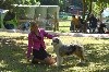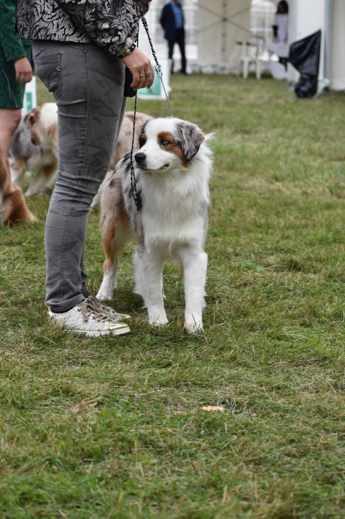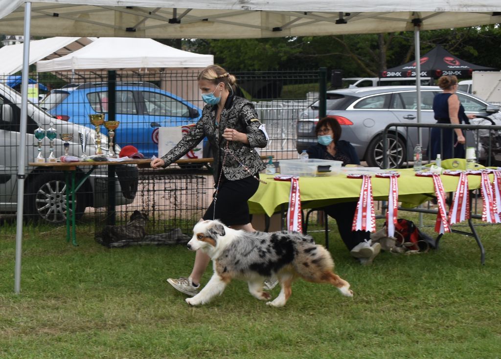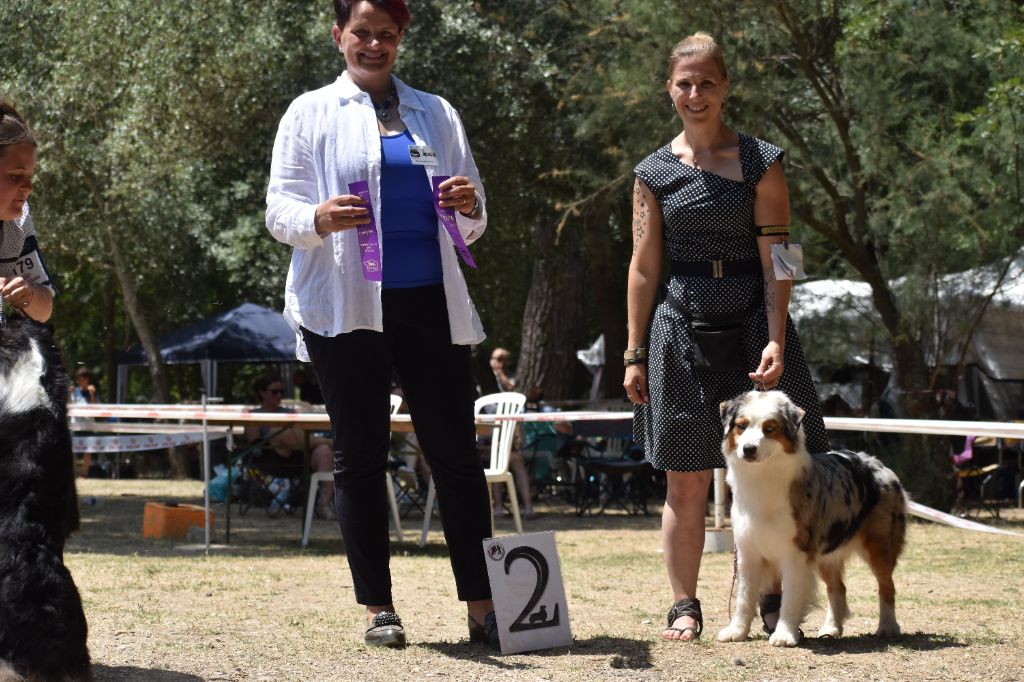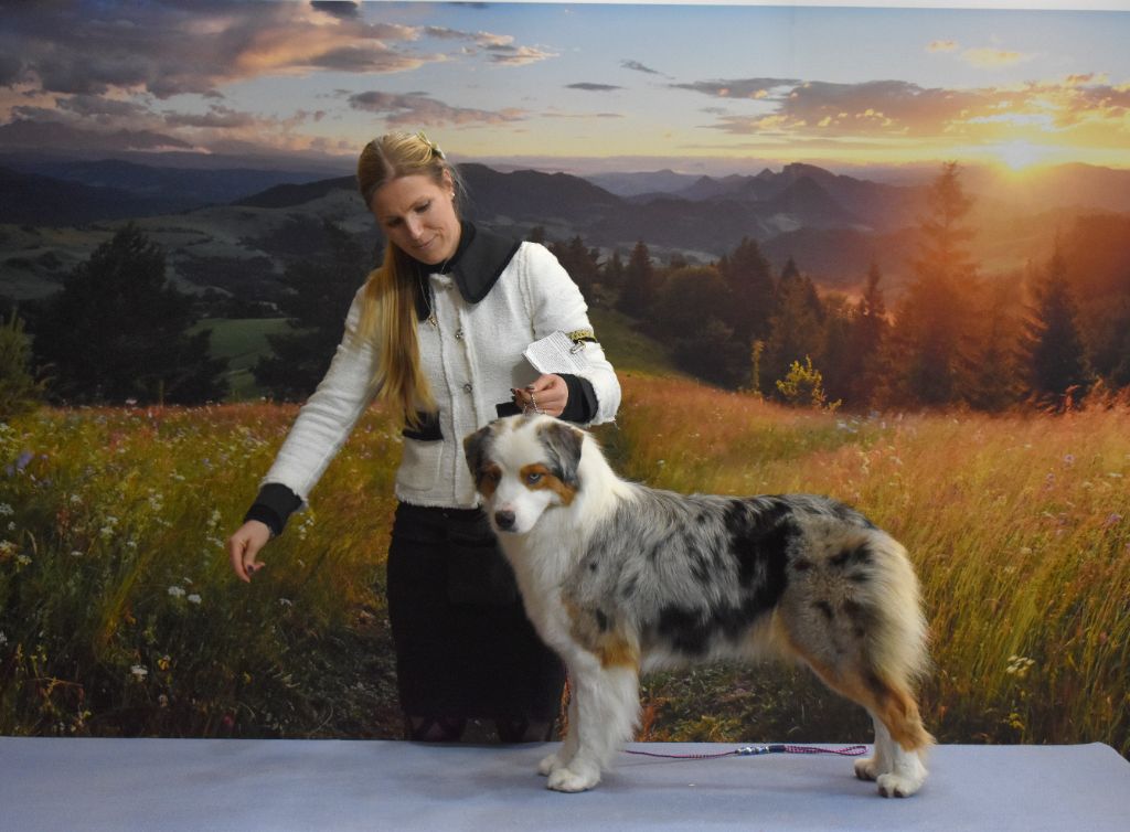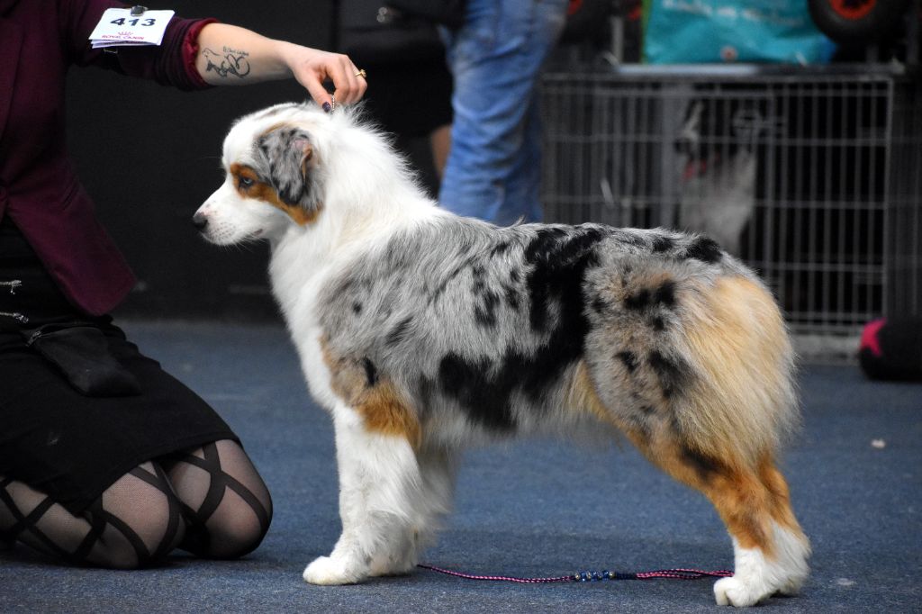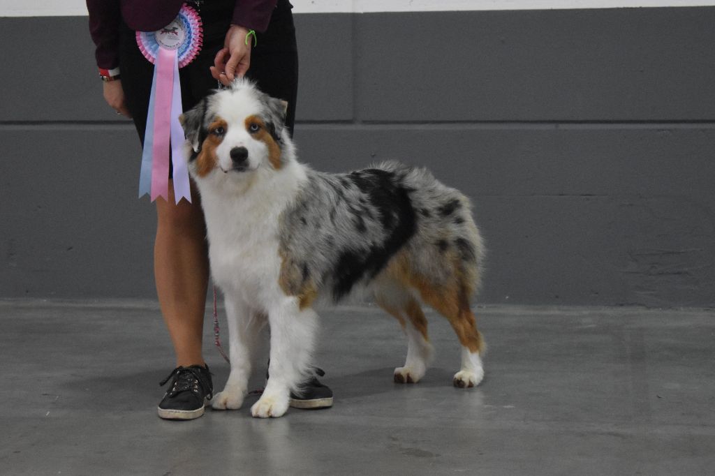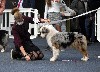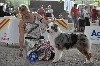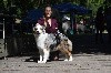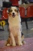 2 ans, sujet féminin de bonne taille, excellent type et construction, tête féminine, le blanc un peu envahissant, DCC, l'oeil de bonne forme, bonnes oreilles, excellente encolure, corps et angulations, belle fourrure, mouvement typique et efficace.