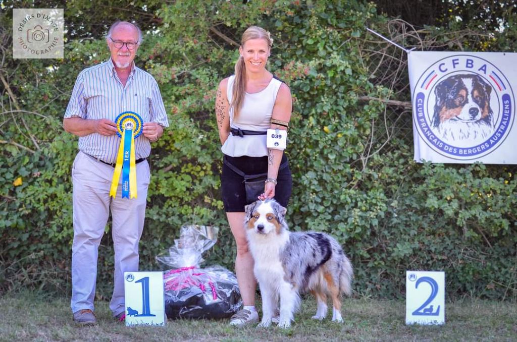 Tête: belle expression, stop bien défini, DCC, excellent parallélisme, excellente pigmentation, très bon port d'oreilles, très bonne forme des yeux.Corps: compact, harmonieux, dos ferme, excellente croupe, excellentes angulations avant et arrière, belle ossature, excellents pieds, excellents aplombs, jolie robe, belles allures, mouvement typique, excellent caractère