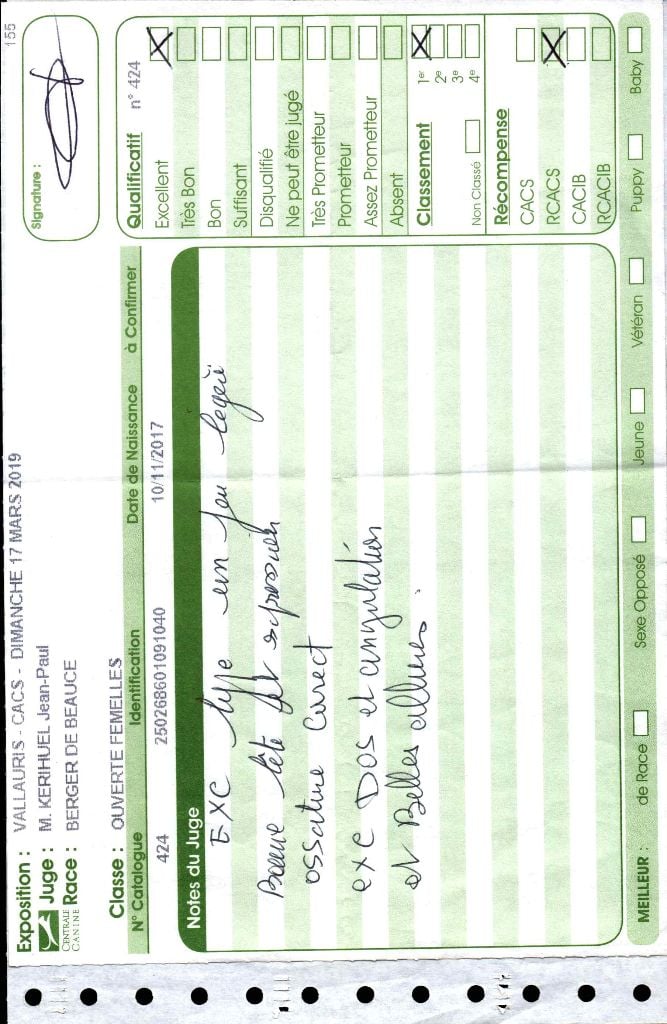 1ère en classe ouverte femelle CACS à Vallauris en Mars 2019