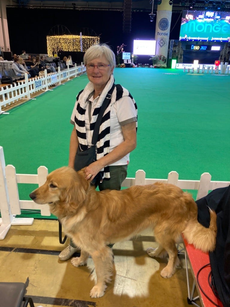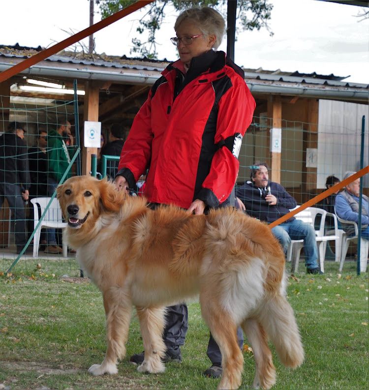 Blond. DCC. Tête très féminine.Exc encolure, ligne de dos.La cage thoracique est bien descendue mais doit se developper. Exc ossature et pieds. Pied arrière légèrement ouvert.Bonne démarche libre avec bonne poussée.Le fouet est porté un peu gai.Chienne qui doit prendre dans la largeur ce qu'elle a pris en hauteur