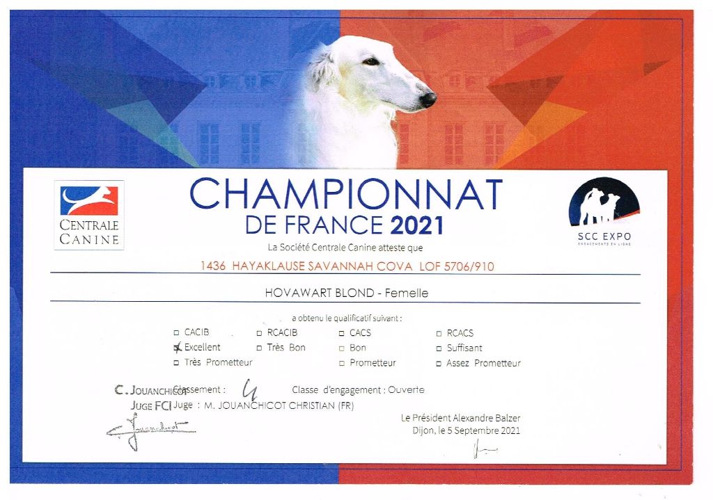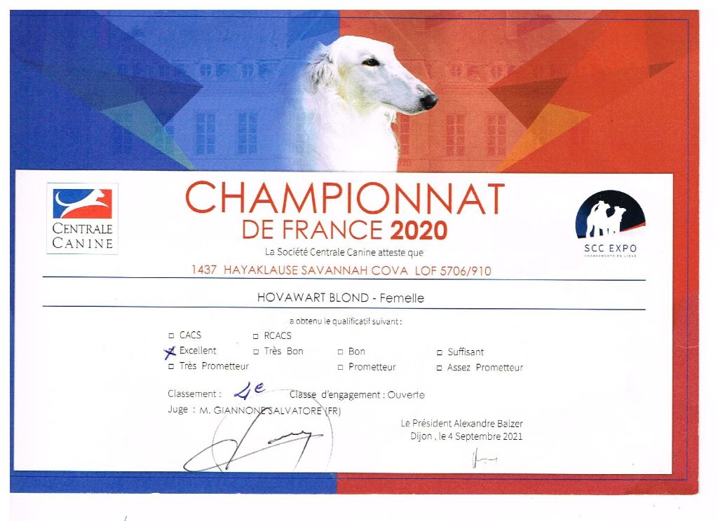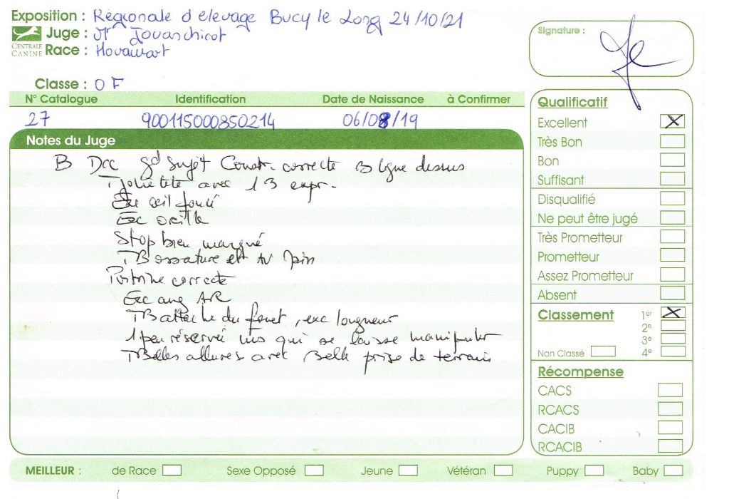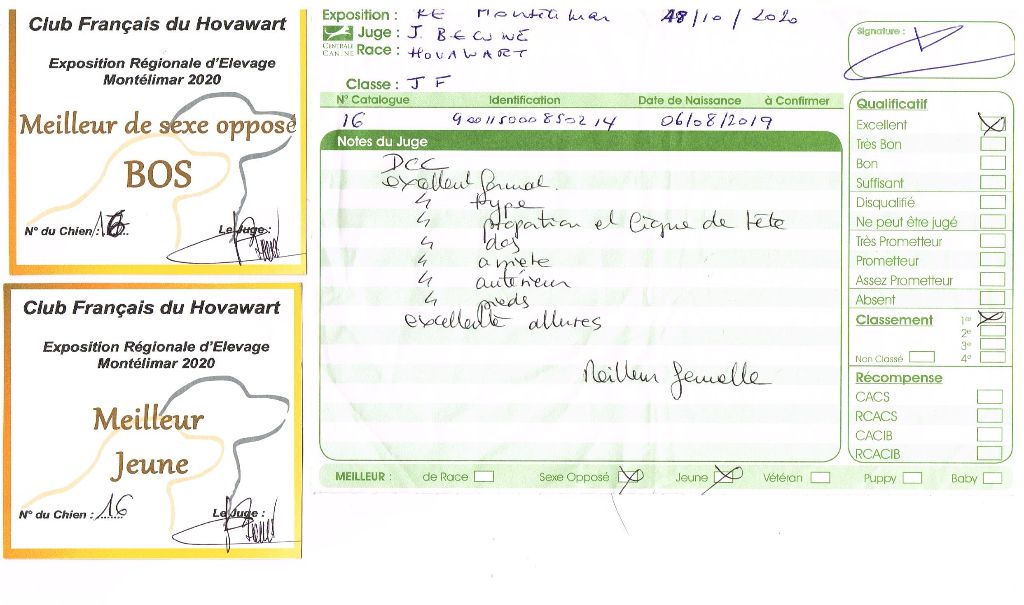 Le printemps 2021 voit la reprise des expositions; classée 3e à La Nationale d'Elevage de Trélazé (classe intermédiaire), Exc1 et BOS à l'exposition nationale de Lunel, Exc1 , CAC et BOS àl'exposition nationale de Trets...ça demarre très bien après ces mois de confinement covid19!