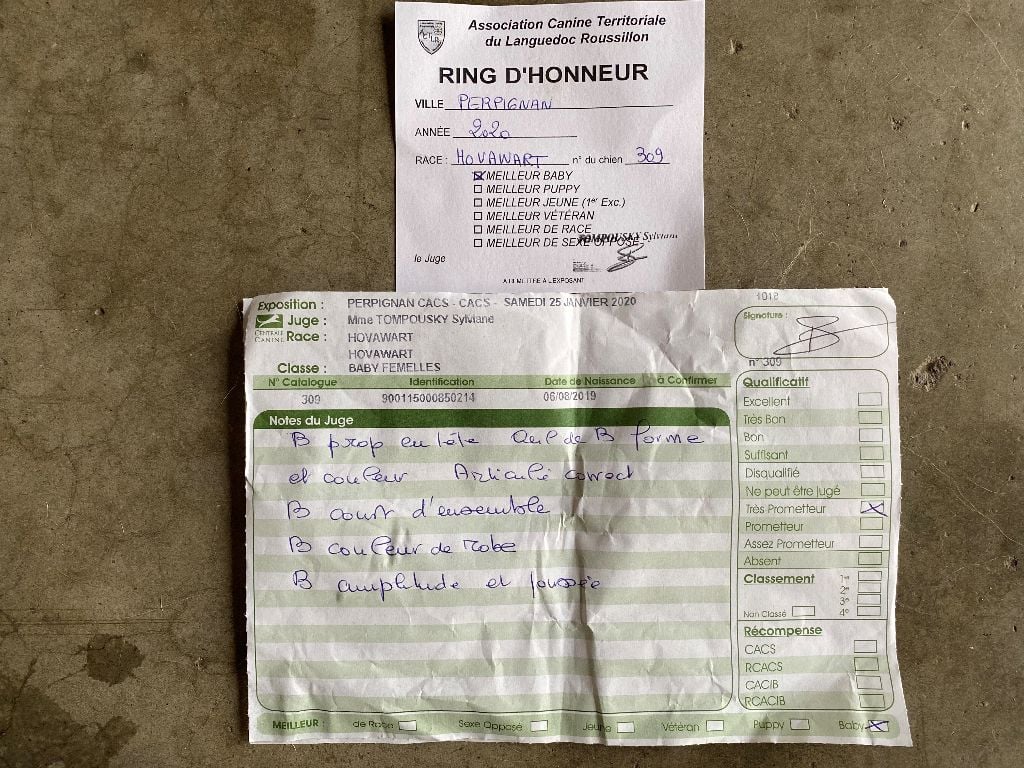 Sa première exposition à Perpignan confirme mon impression: excellent commentaires de la juge, avec un Tres Prometteur et Meilleur Baby...premier Ring d'Honneur pour la petite!