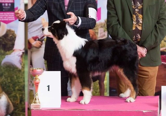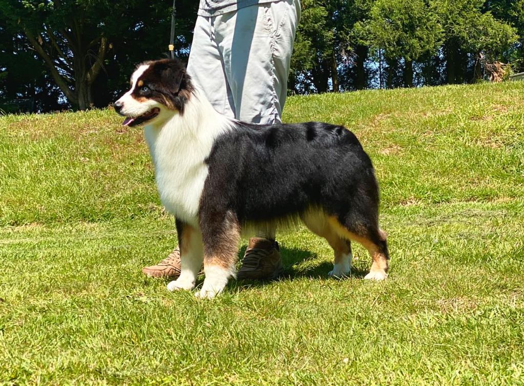 Commentaires :Beau modèle - Noir tricolore - 2 yeux bleus - Excellente proportion. Très belle expression, excellente tête, oreilles très bien placées. Excellent crane / chanfrein. Excellente couleur truffe. Excellente encolure + ligne dos + croupe. Poitrine va se faire. Excellente côte + grasset + pieds. Bon mouvement. Excellente fourrure. Excellente présentation et caractère.Mention "Excellent"