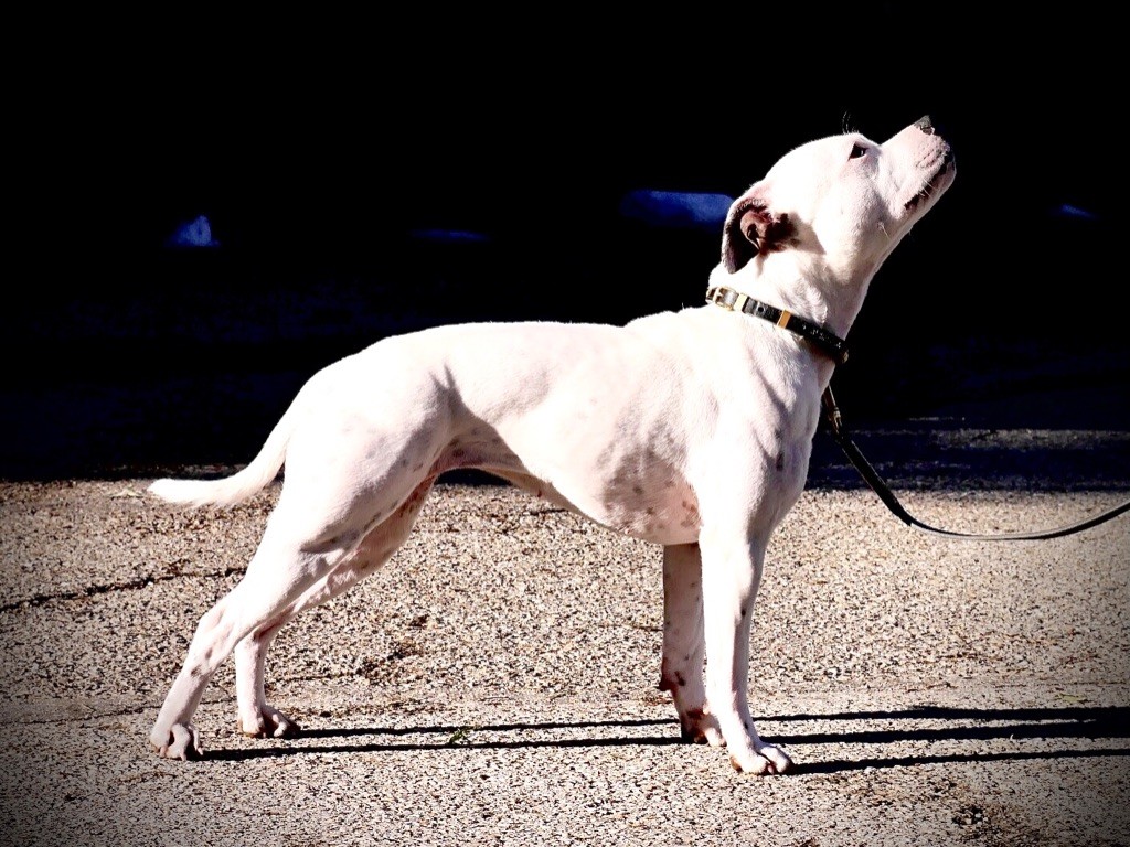 10 months old white bitch. typical feminine head. would like more muscle on cheek and foreface, more filling under eyes. clean mouth with correct bite. dark eyes. nice deep brisket. straight front legs with tight feet. excellent topline and angulation. nice short body. movement ok. lovely character.