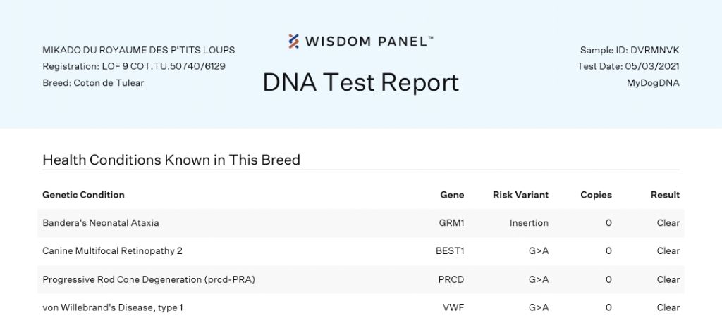 Progressive Rod Cone Degeneration (prcd-PRA) - Homozygote normalLuxation rotules: - 0/0Canine Multifocal Retinopathy 2 - Homozygote normalBandera - Homozygote normalvon Willebrand - Homozygote normal