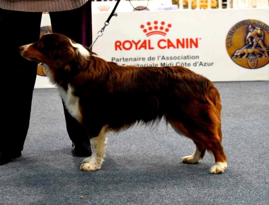 Dans le standard , rouge Excellente silhouette.Jolie expression , le chanfrein devrait être un peu moins long. Bon déplacement . Un peu timide .