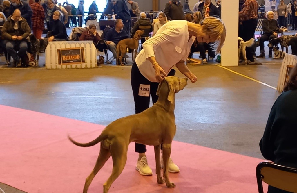 Excellent type-poitrine un peu étroite-excellent dos-très belle tête et expression-excellente angulations.Exc. Type-bonne taille-se présente bien-belles allures-Exc. Aplombs.Une belle reprise pour notre Naloute avec 8 mois sans exposition. Une journée conviviale, avec de jolies concurrentes, faites de retrouvailles Nadine et son papa, Aurore et Jean-Luc, Nathalie Bouard venue nous remettre notre diplôme et nous offrir de quoi se rafraîchir et grignoter.