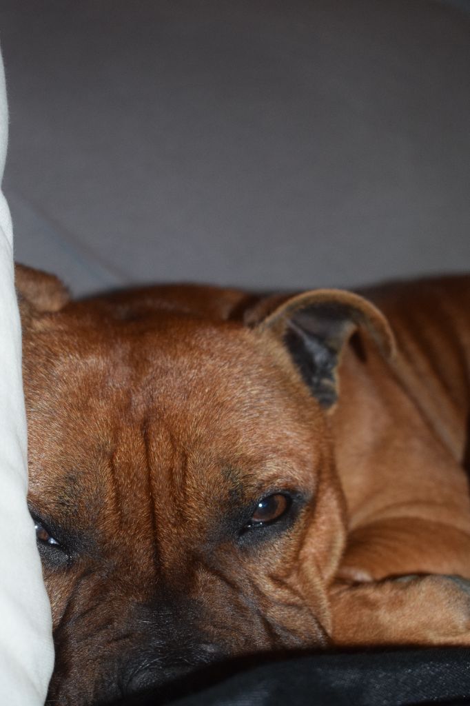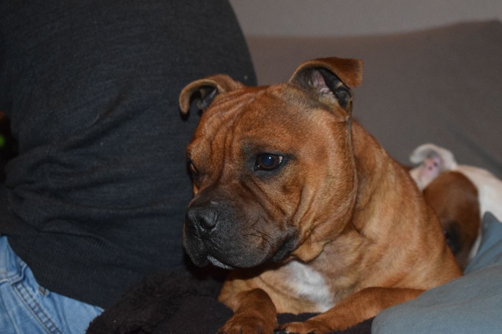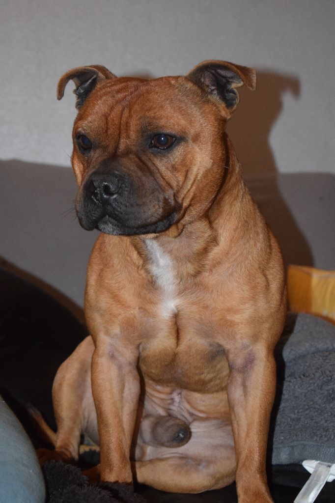 Chien Staffordshire Bull Terrier Patchy red skin aka aslan du Royaume Du Nanny Dog