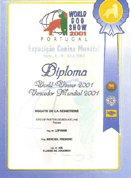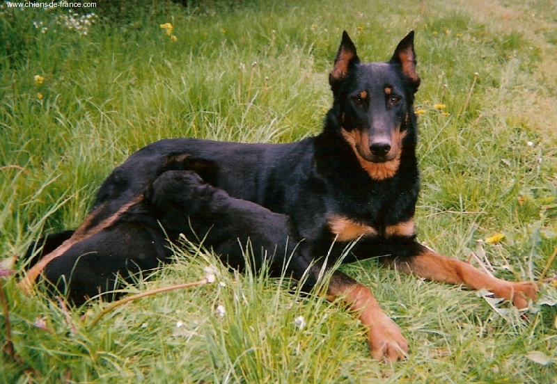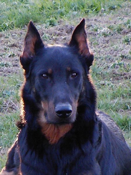 Notre première femelle, celle qui nous a donné l'amour du beau et bon beauceron. C'est elle qui nous donné le virus des expos. Sa carrière pourrait en faire envier plus d'un, avec de nombreux CACS / CACIB / MEILLEUR DE RACE / MEILLEUR DE GROUPE, une 4ème place en Championnat de France et en Nationale d'élevage, et un titre de CHAMPIONNE DU MONDE JUNIOR.