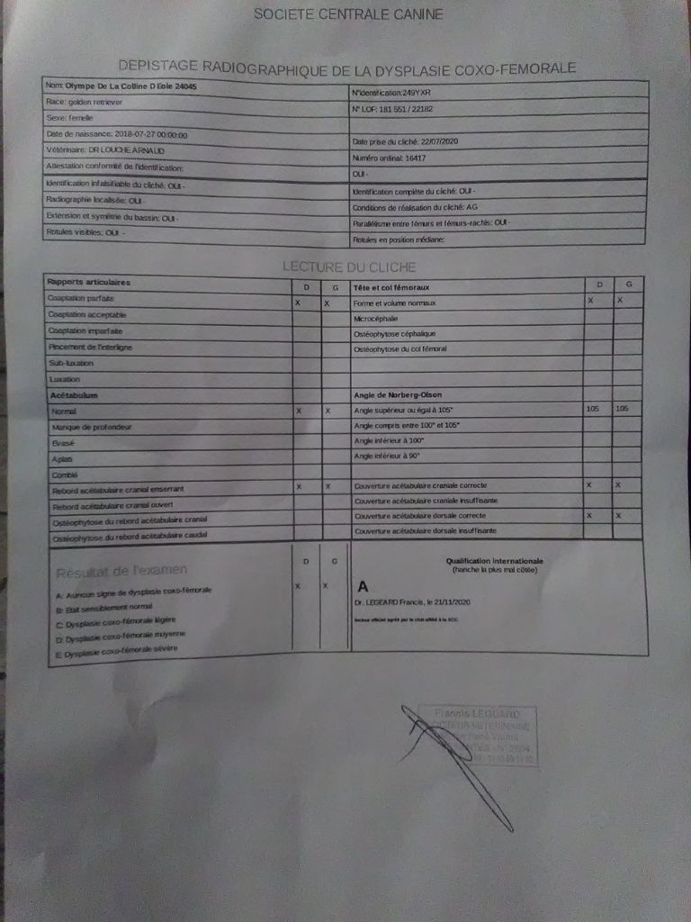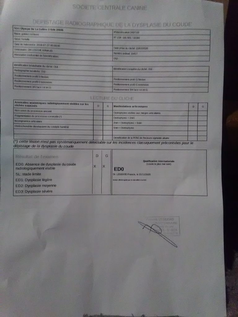 Ichtyose - Exempt +/+Neuropathie Ataxique Sensitive - Exempt +/+Myelopathie dégénérative type A - Exempt +/+Identification ADN - OuiEpidermolyse Bulleuse - Exempt +/+Dystrophie musculaire type Duchenne : - Exempt +/+Dysplasie du coude - 0/0Dysplasie de la hanche - A/AAtrophie retinienne progressive Prcd - Exempt +/+Atrophie retinienne progressive Gr-pra1 - exempt +/+Atrophie retinienne progressive Gr-pra2 - Exempt +/+