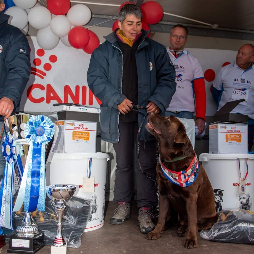 Polyvalent, il a fait ses preuves en travail de Retriever et a obtenu son TAN et son sélectif A et sort également de bons résultats en expo avec des CACS, meilleur de race en 2022, de nombreux excellents mais sa préférence reste le travail à l'eau.