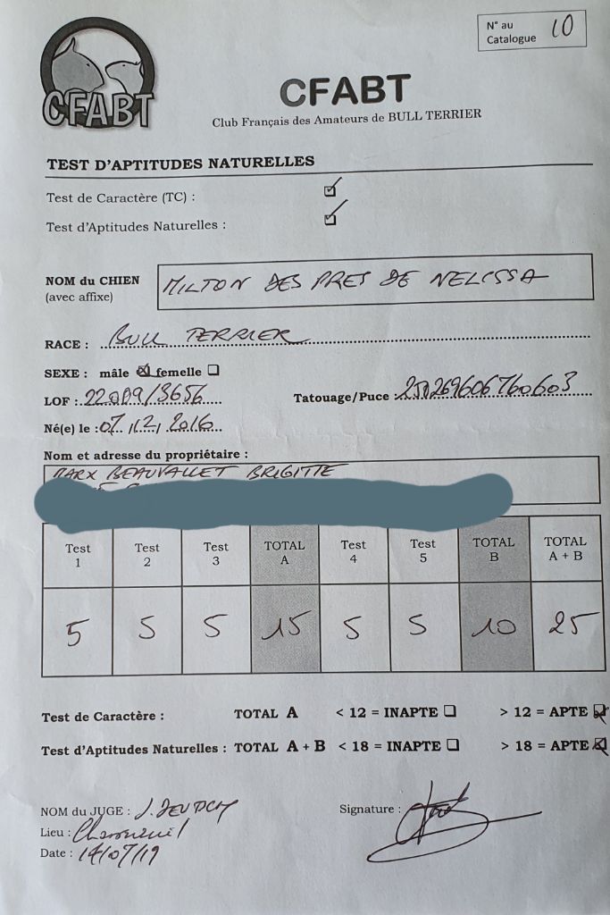 Sujet puissant avec bonne ossature. Profil de tête correct. oeil de bonne forme. Bon port d'oreille.encolure puissante pourrait être + dégagée.Dos solide. Epaule bien placée. Bras pourrait être + incliné. Bonne profondeur de poitrine. Poitrail pourrait être + ouvert. Arrière main correcte. Bon caractère. Correct dans son déplacement.