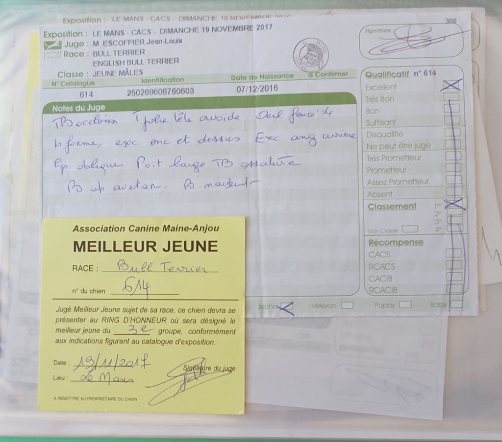 EXC tête.EXC encolure, poitrine et dos.TB angulation avant. EXC angulation arrière.TB mouvement. TB présentation