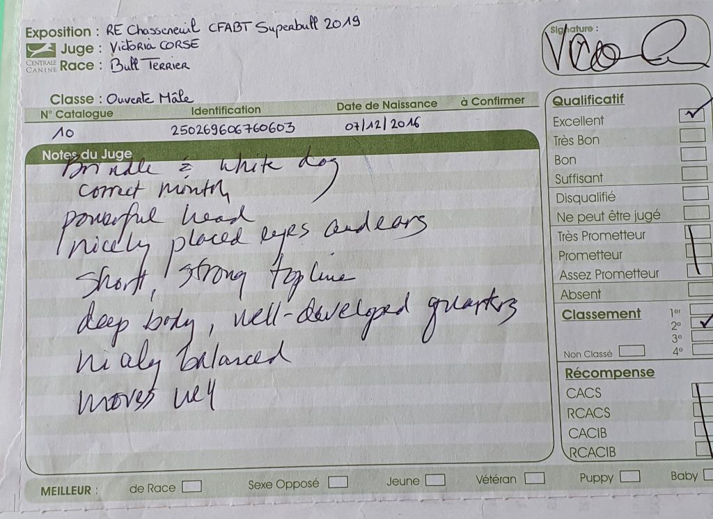 Tête ovoïde yeux de bonne forme et couleur. Denture acceptable. Exc encolure. Dessus solide. Ossature puissante. EXC angulations avant arrière avec cuisses bien gibotées.Exc mvt typique à l'avant.