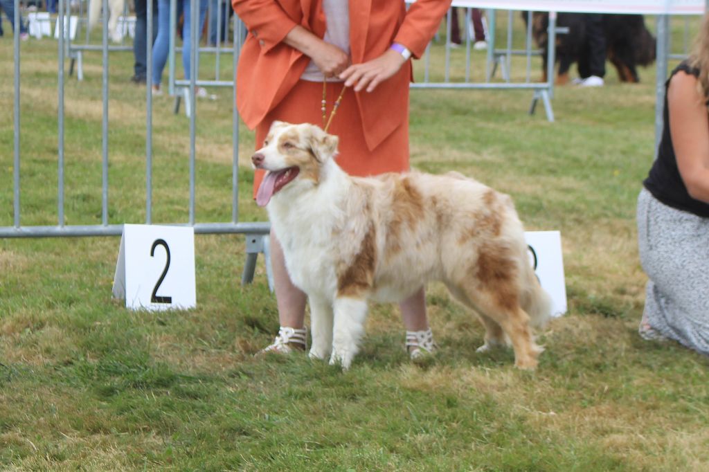Spéciale de race, classe intermédiaire : 1 1/2 ans, very nice breed type, correct head, exc ribcage, well shape body, well angulated, move ???, need more training for the show. C'était sa 1ere expo et de plus chien du confinement.