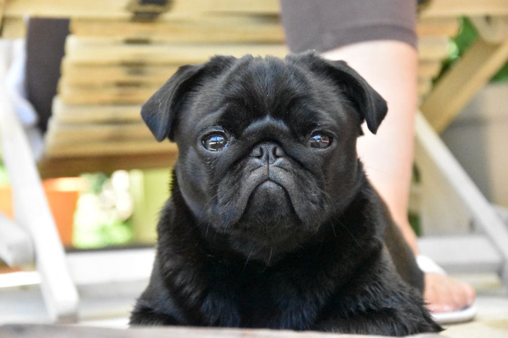 Côté physique, c'est une belle femelle carlin noire, de petit gabarit (6,3 kg), à l'allure assez fine. Elle a de bons aplombs, une belle ligne de dos, une superbe expression. Sa queue est en simple boucle, mais elle a une superbe allure quand elle marche. Elle se débrouille bien en expo, d'ailleurs !
