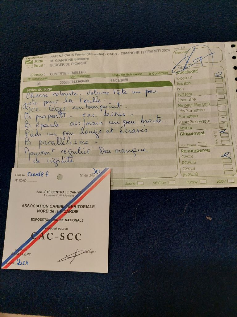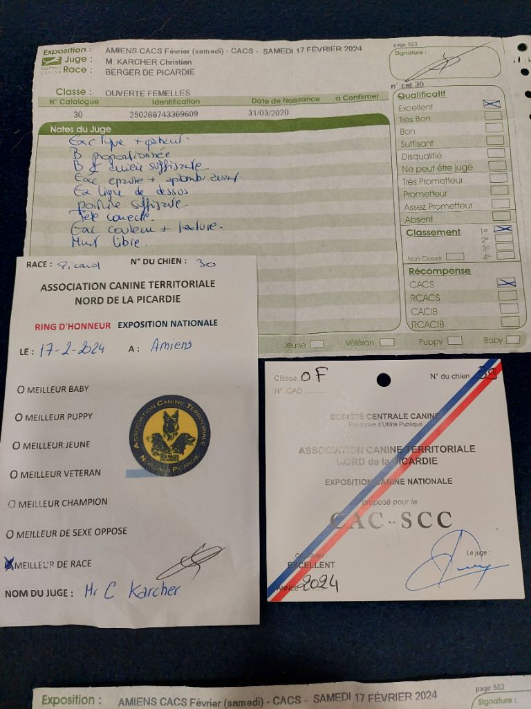 une chienne exceptionnelle , une couleur magnifique et un super caractère et des allures magnifiques , il m'a dit qu'il y avait longtemps qu'il n'a pas vu une picarde aussi splendide