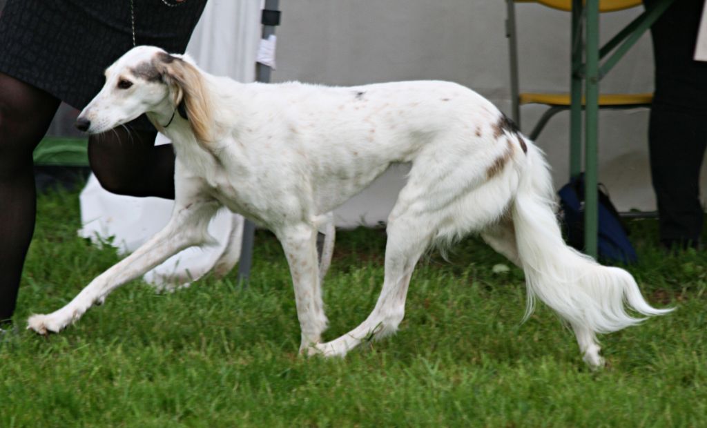 Femelle particolore aux belles proportions. Jolie tête féminine avec très bel oeil, excellente pigmentation, DCC, exc oreilles, exc encolure et ligne de dos, exc angulations av arr, exc poitrine bien développée, fouet de bonne longueur, exc pieds, exc mouvement, le fouet est porté un peu haut.